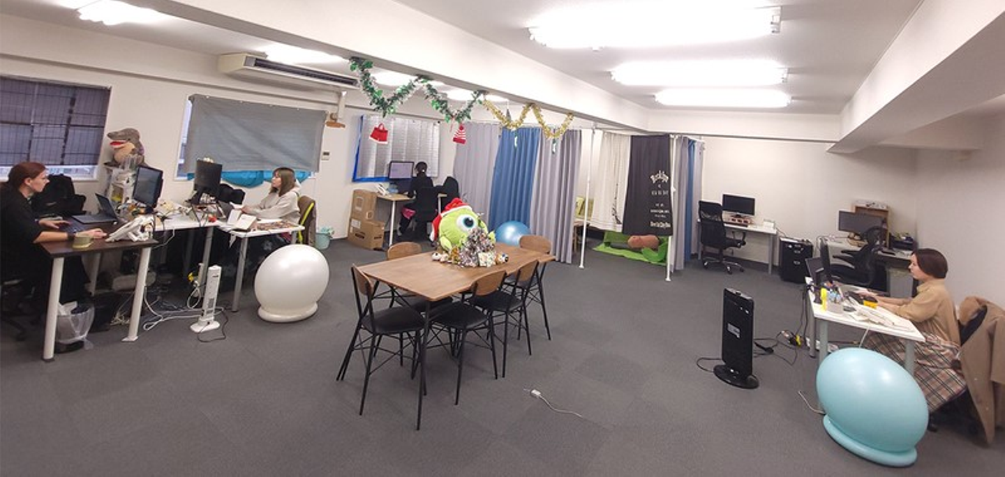 入社時に1人に1つバランスボールを支給していて私個人はPC作業で疲れたときに仰向けでゴロゴロして肩甲骨を伸ばす癒しアイテムとしても活用しています。