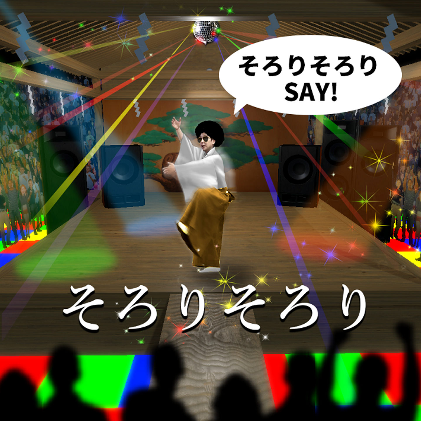 やまびこ狂言アフロとは、ディスコの中に立つ狂言師の動きとセリフをコール&レスポンス(やまびこ)で、VRゴーグルと両手のセンサーを使って、リズムに合わせて声と動きを真似するリズムゲームです。