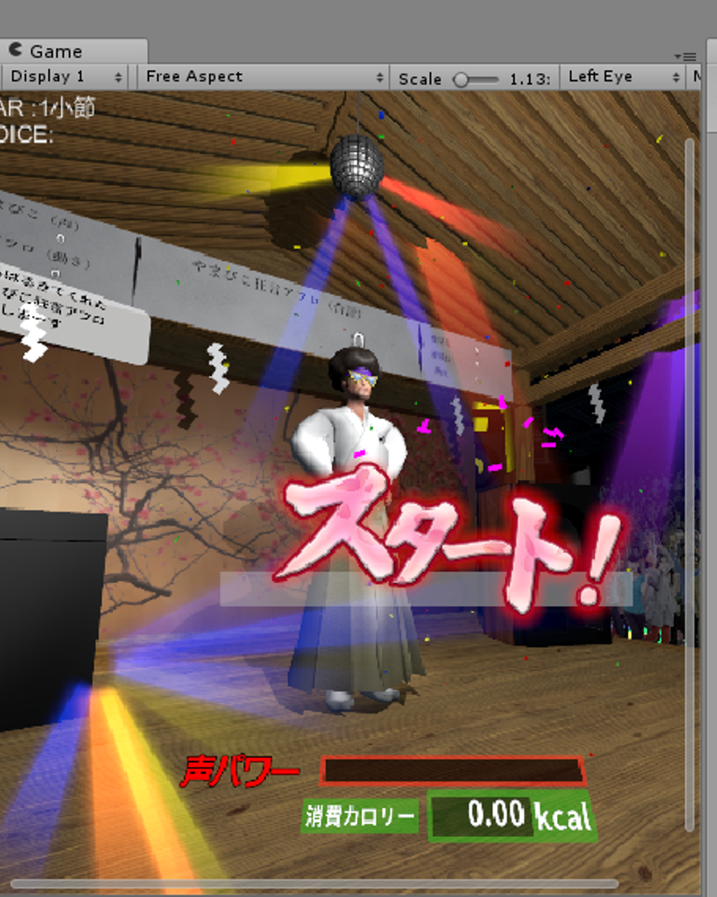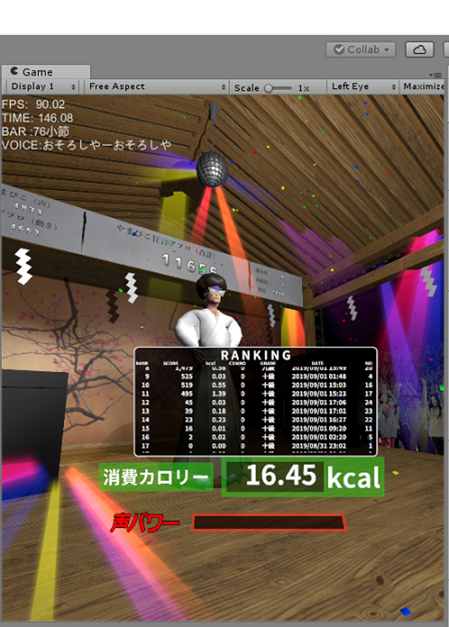 ゲーム画面が出来上がりました。プレイヤーの得点は師匠のお手本にどのくらい”やまびこ”(コール&レスポンス)ができたかに加え、声の大きさや消費カロリー、コンボ数が関係してきますので、プレイ中にそれぞれの状態が分かるよう表示しました。コンボはコンボ達成時に表示されます。