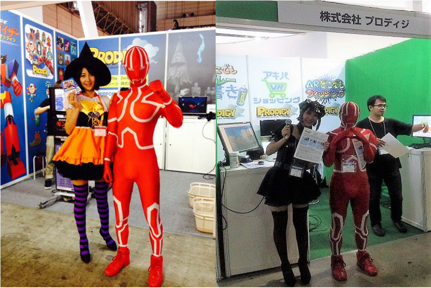 2014年はスマートフォン/ソーシャルゲームコーナーで10個のオリジナルゲームアプリを展示、2015年はスマートフォン/ソーシャルゲームコーナーで「バーチャル肝試し」と「ギンガイザー バトルオンライン」を展示、2016年はVR/ARコーナーにて「アキバVRショッピング」「ARどこでもフィッシング」「ARどこでもスプレー落書き」を展示しました。プロディジのマスコット的存在のリアルアキバマンも駆けつけて、テレビ局の取材も受けさせていただいたんですよ。