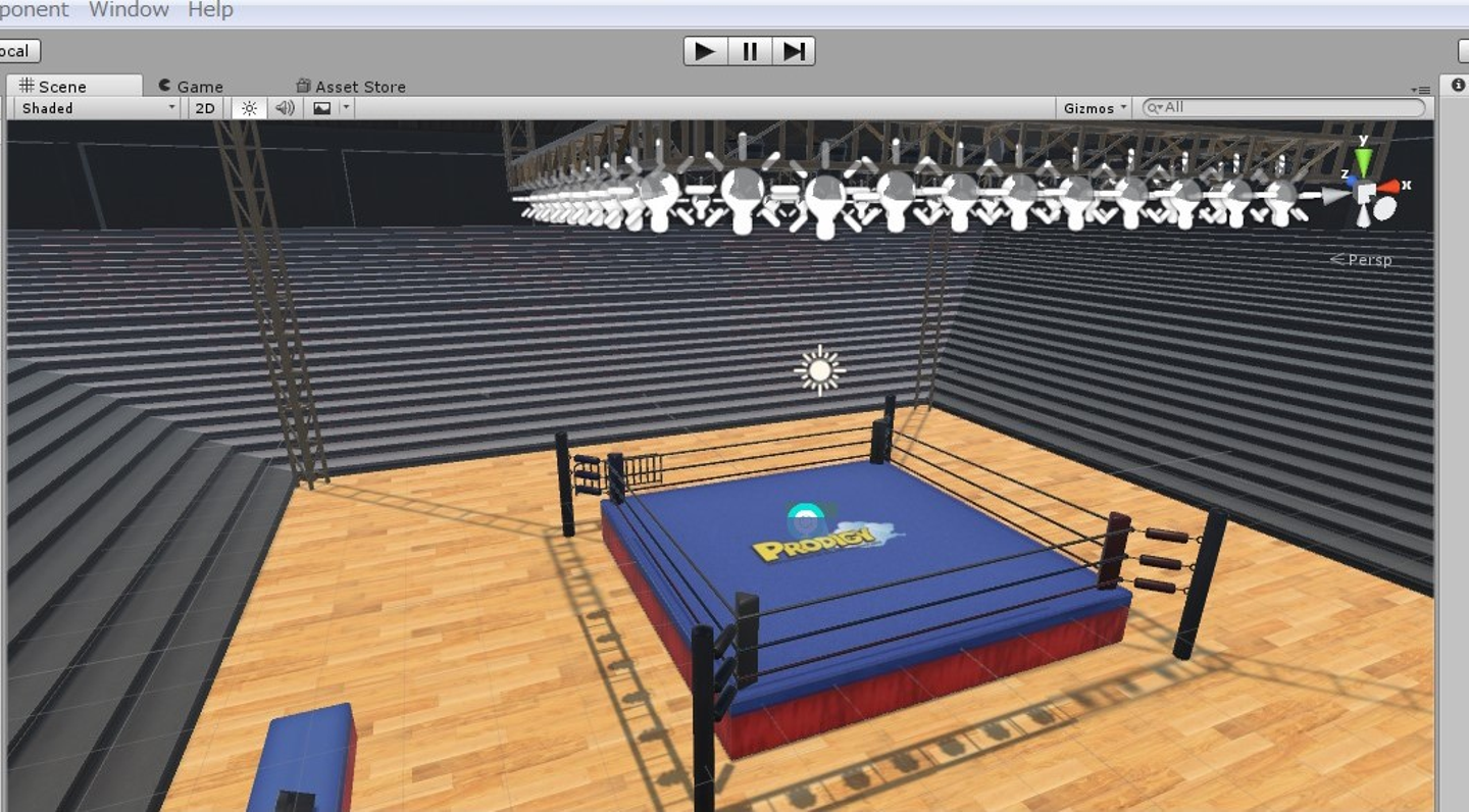 まずは会場やリングを設置しました。5万人収容の会場なので広いですね。リングマットにはプロディジのロゴ入りです。この段階では動かないものが多いので開発はどんどん進みます。