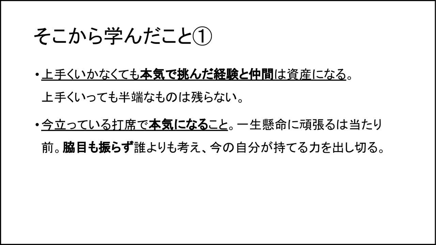 自分の価値を決めるのは過去の自分ではないということが、これまでの経験や失敗から得た学びです。得意不得意で考えるとこれまでやってきたことでしか判断ができず、過去の自分が未来の自分を決めてしまうということにもなるので、今の自分で判断をしなくていい。また、本気で挑み続けると何かしらで芽が出るということ。そして、信頼関係を作るとそこから良い関係だったりお客さんが増えるという事を実感しました。