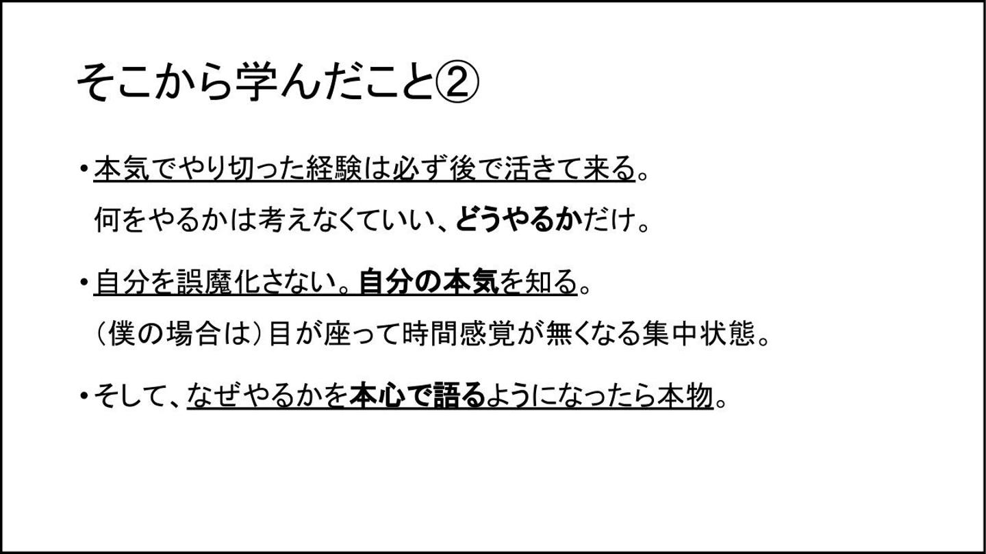 少し前、新卒採用の面接で「入社が決まったら何を準備したらいいですか?」と聞かれたのですが、同席していた人事本部長の名越さんが「今やっている事を目標値を上げて本気でやり切ってください」と答えていて。結局何をするかは大事ではなくて、その人の限界を突破するような経験を何回しているかが重要で、その経験が後々生きてくるんですよね。