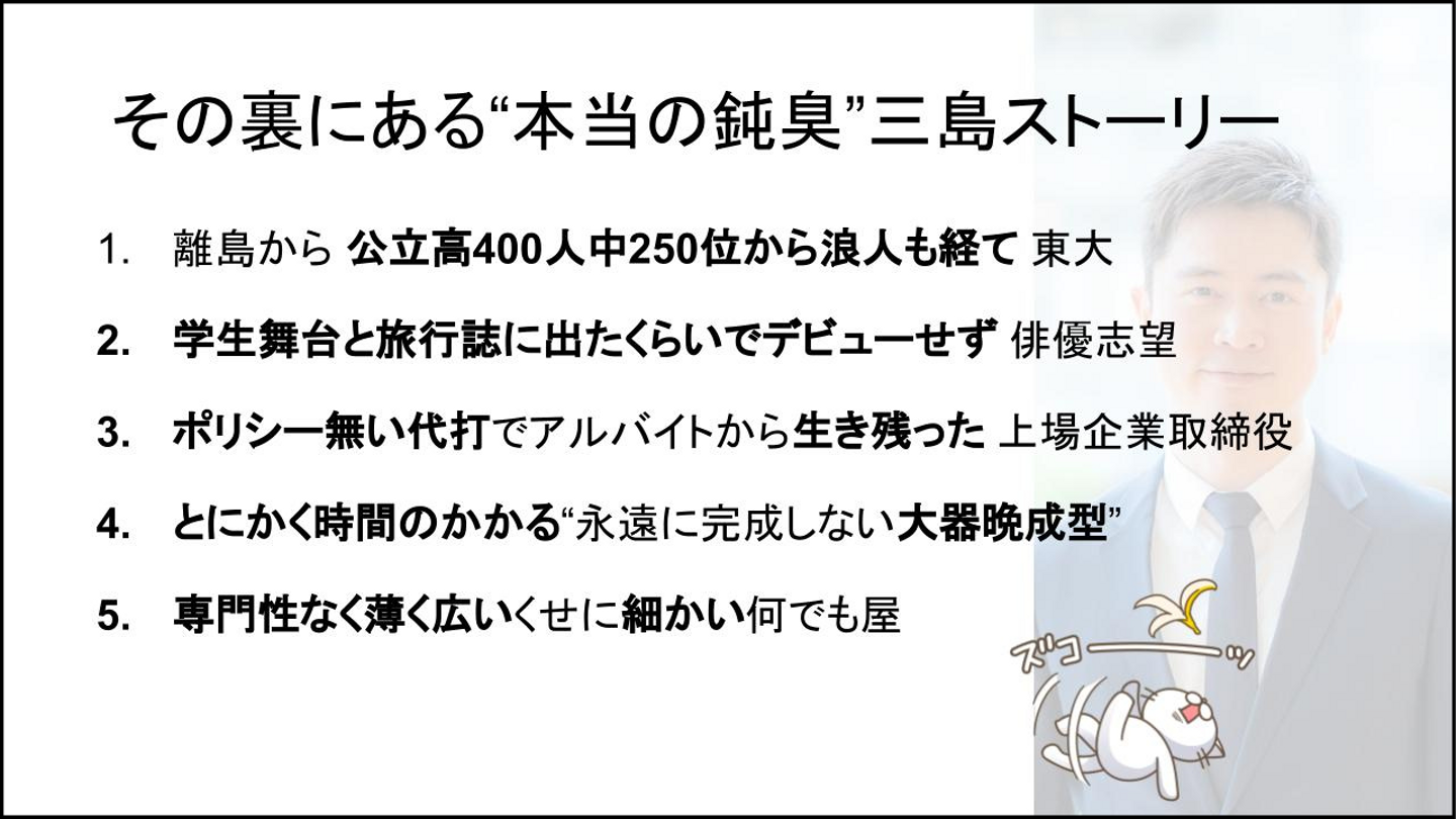 ここまで話して、離島から東大へ進学して就職せず俳優を目指し、アルバイトで入社して、現在の取締役、と...僕のプロフィールを見ていくとすごくカッコ良く見えるかもしれないのですが、本当はすごく鈍臭いタイプの人間です。まさかここで?みたいなところで転んじゃうようなタイプ。本当に。なので、今日は裏側のライフストーリーも紹介したいなと思います。