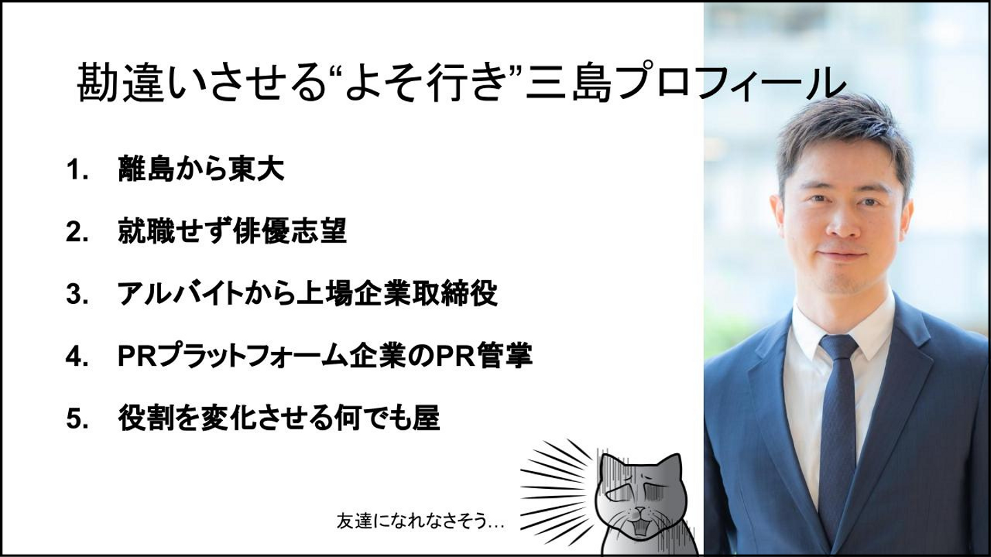 三島:最初に自己紹介していきます。僕は離島出身で、東京大学に通うため上京してきました。卒業後は、俳優を目指しながらアルバイト生活。その後、ご縁あってPR TIMESに入社し、今は取締役として働いています。一言で表すと、役割を変化させるなんでも屋さんです。