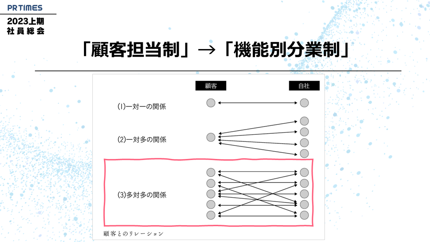 最初の大きなきっかけは、長年続けてきた顧客担当制から、「機能別分業制」に変えたことだと思います。