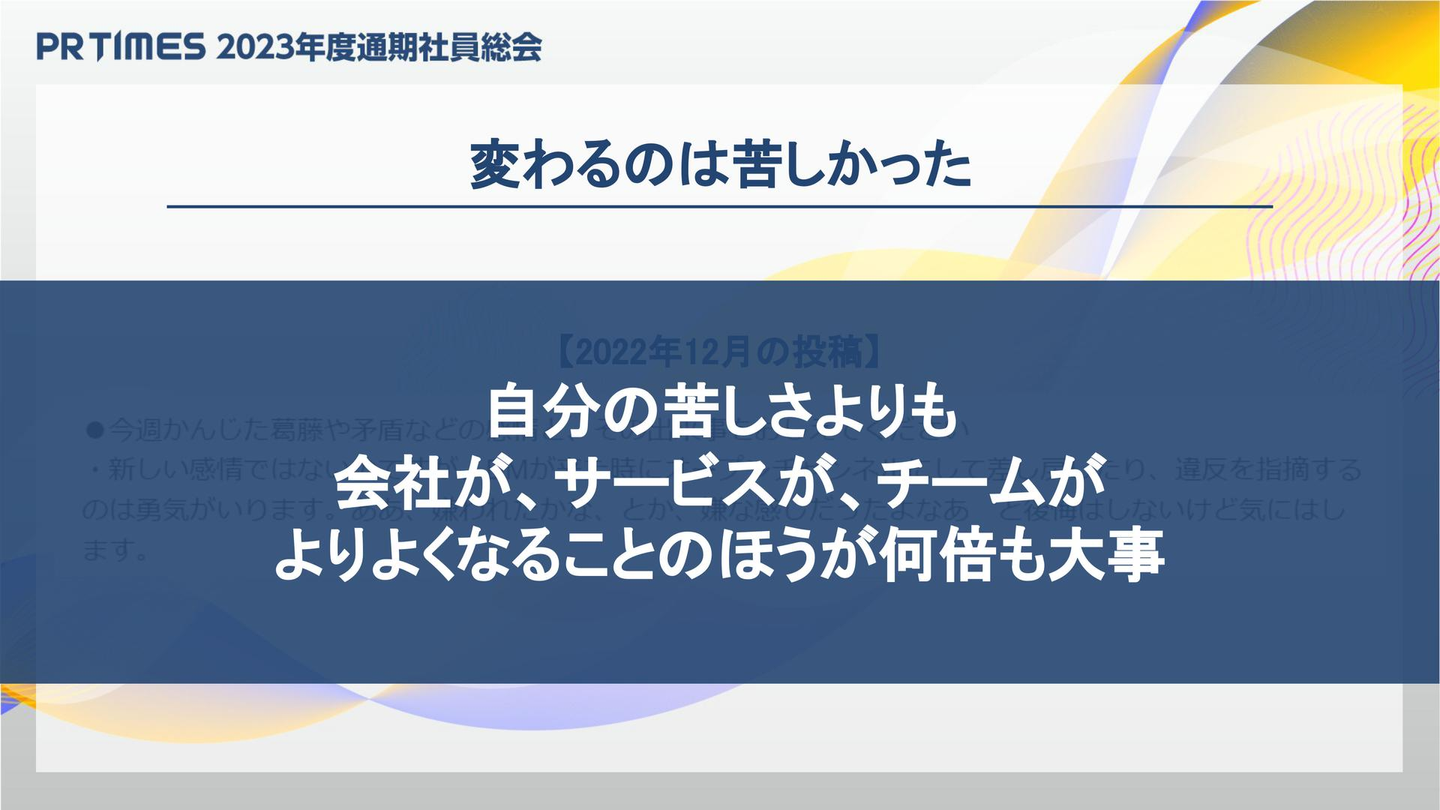 小暮:2022年度末、営業本部の状況が苦しいとき、PR TIMESが衰退していく未来をちょっとだけ想像してしまい、それが心の底から嫌だと思いました。自分にとって、なぜこんなに嫌なんだろうって振り返ったときに思い出したのがPR TIMESでの原体験です。