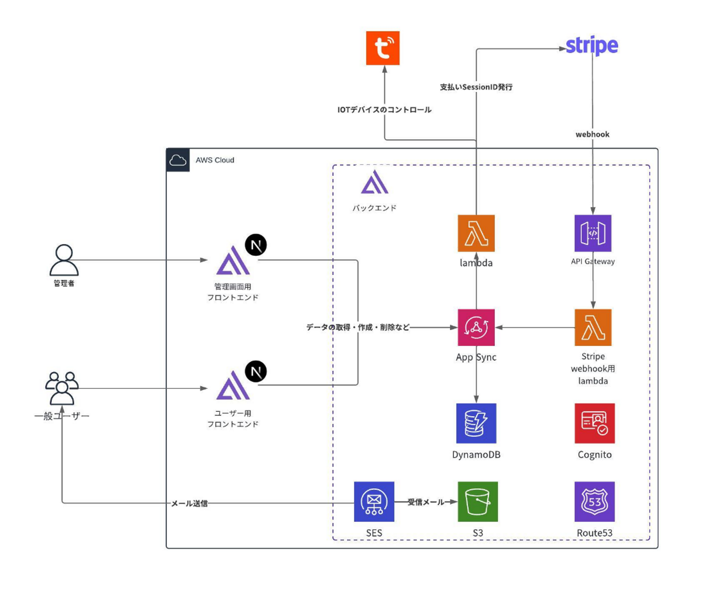 決済システムに関しては、Stripeを採用し、IoTデバイス自体はTuya.comを利用して内部で制御しています。
