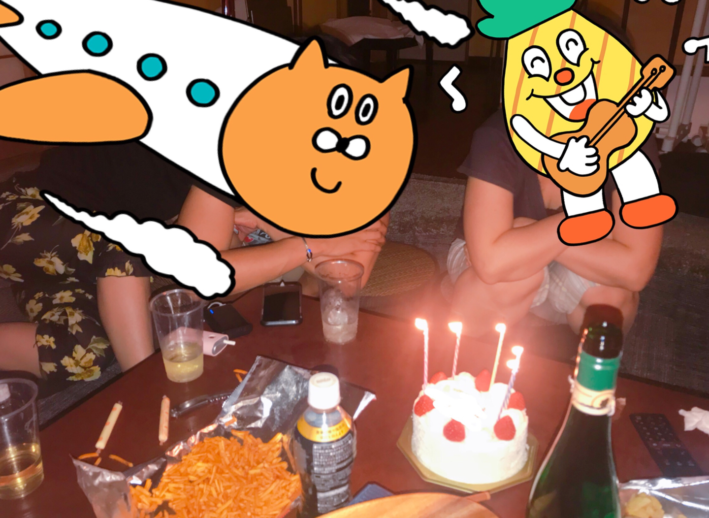 お風呂後の飲み直しタイムでは、5月生まれの従業員へのサプライズケーキも用意しました!