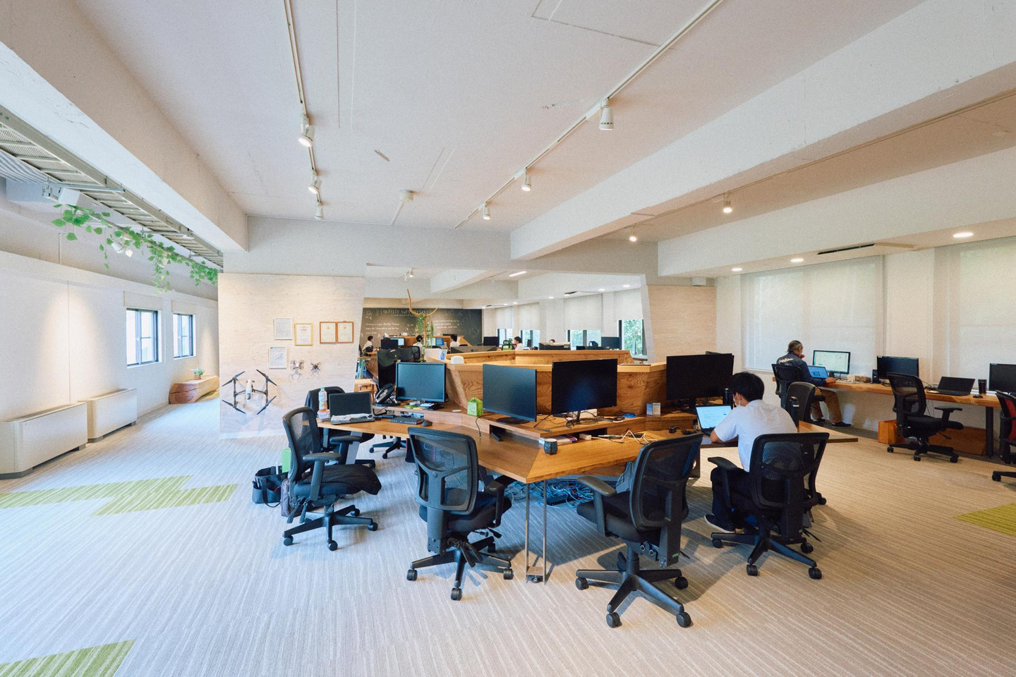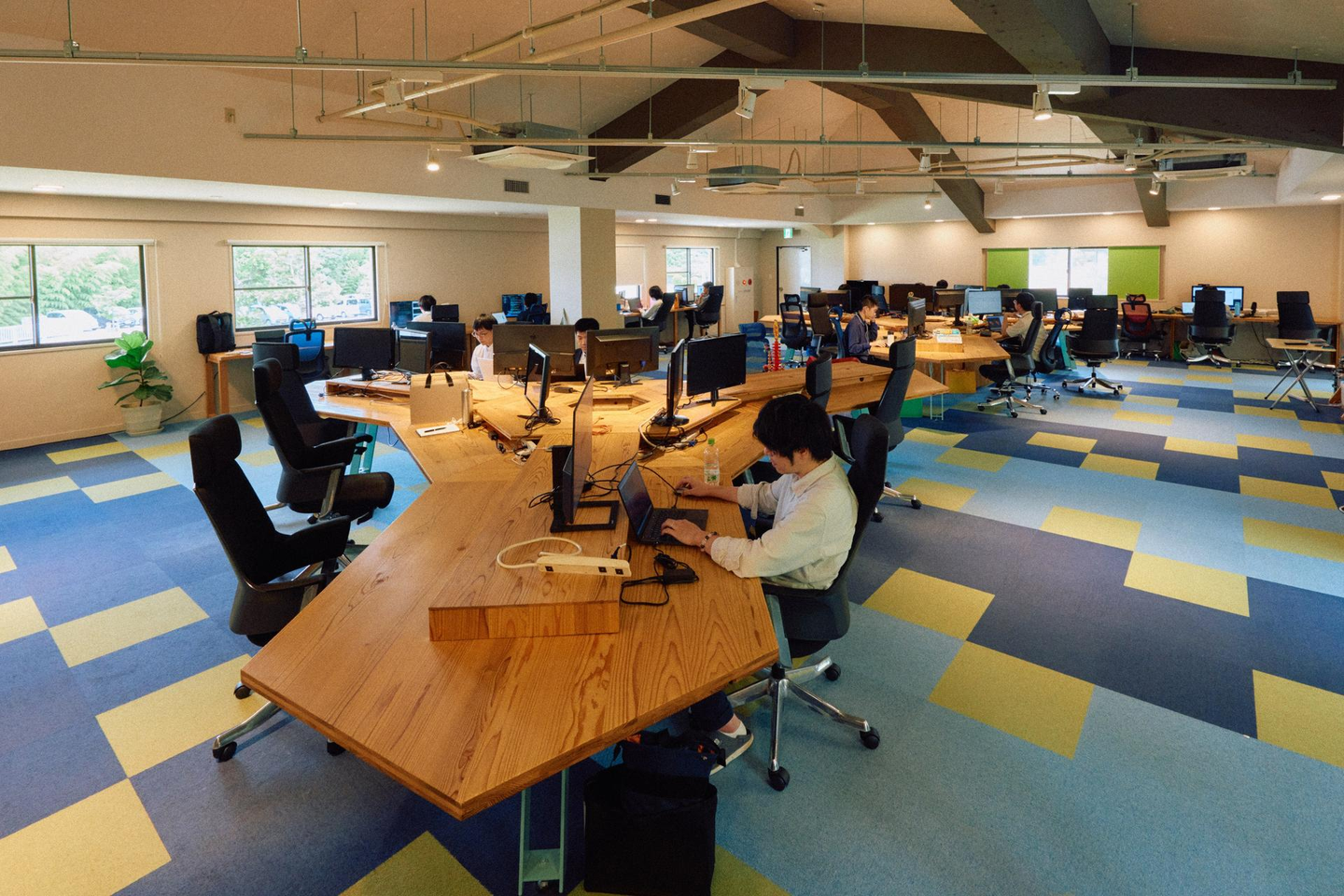 まずは、開発スタッフ、コーポレートスタッフなど様々な職種のスタッフがいる執務室エリアをご紹介します!! 地元の紀州木材を使用したデスクで優しい空気に包まれています。