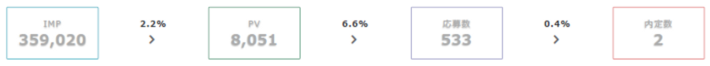 業種によってももちろん差異はあるにしても、indeed経由の場合はPV(indeedだとクリック)からの応募率は良くて1-2%程度です。上記の数値はその2倍3倍ですからかなり転換率が良いですよね。となると、ユーザーの質が良いか、僕らの募集内容がユーザーにバチッと刺さったかみたいな話ですね。