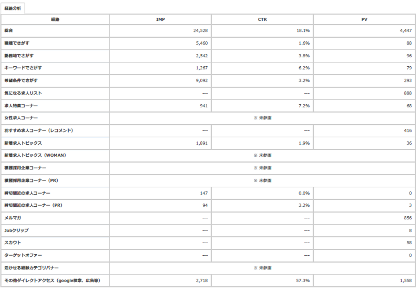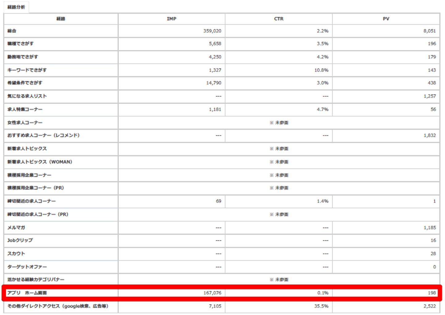 クリック率などは差異があるもののさほど気にならないですね。気になるとすれば、②にだけ「アプリ ホーム画面」があるのでそこが結構インプレッションを稼いでいますけど、PV数にはあまりつながっていないという点。あとはPVが②の方がどの項目もおおよそ2倍程度なので単純に名古屋だけの募集だった①に比べて、東京も入れた②の方がインプレッションされやすかったというだけですかね。