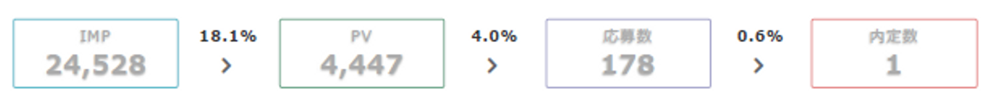 インプレッションからのPVには大きな差がありすぎてなんとも言えない感じ(そもそもPVの質が違いすぎるんじゃない的な)ですが、PVから応募数への転換率は約1.5倍の差はあるものの概ね同じような水準です。で、それがかなり高いですね、6.6%ももちろんだし、4.0%だって十分高い。