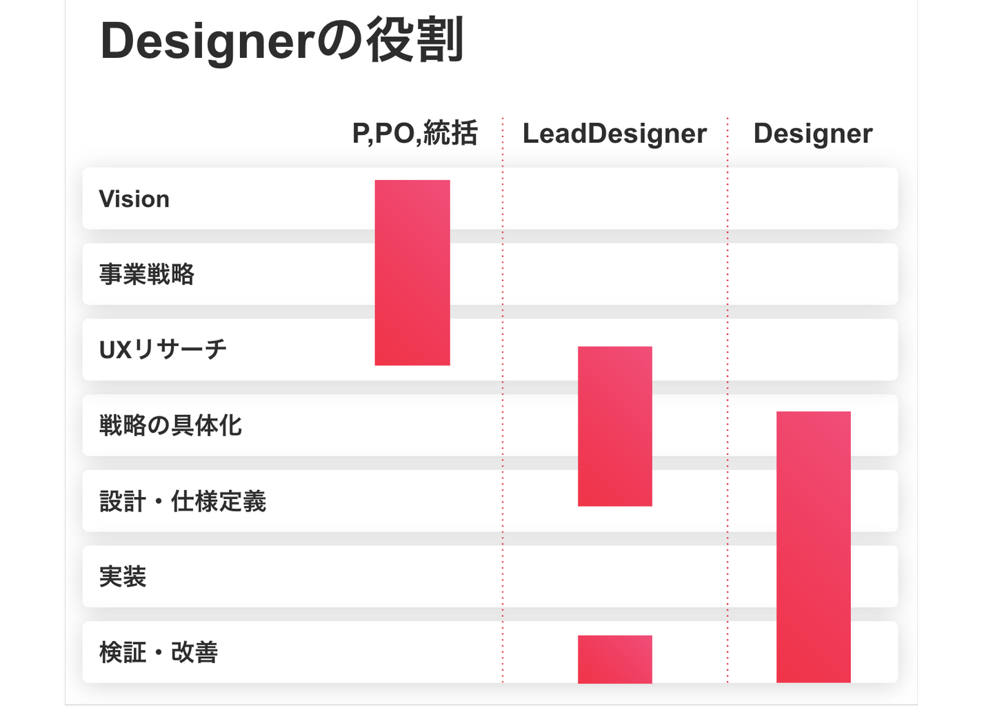 クイックのデザイナーは、制作はもちろん戦略・サービス設計にまで携わる点が特徴です。デザインにあたって共有された「事業戦略やミッション」から、デザイン戦略の具体化や設計・仕様の定義など「何をすべきか」をデザイナー自身が考え、自走することを推奨しています。リードデザイナーであれば、さらに上流の事業戦略の策定に関わるなど、デザイナーの領域を超えた活躍も可能となっています。