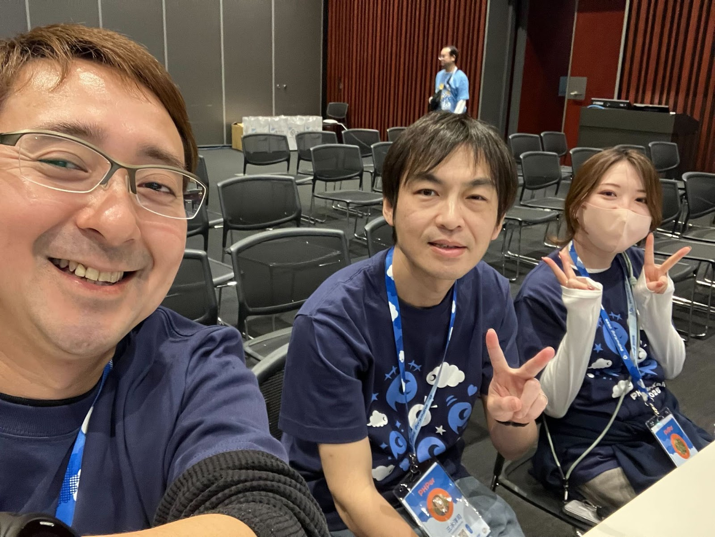 PHPerkaigiTシャツを来てオープニングに参加する、桃原(左)、三木(中)、関根(右)