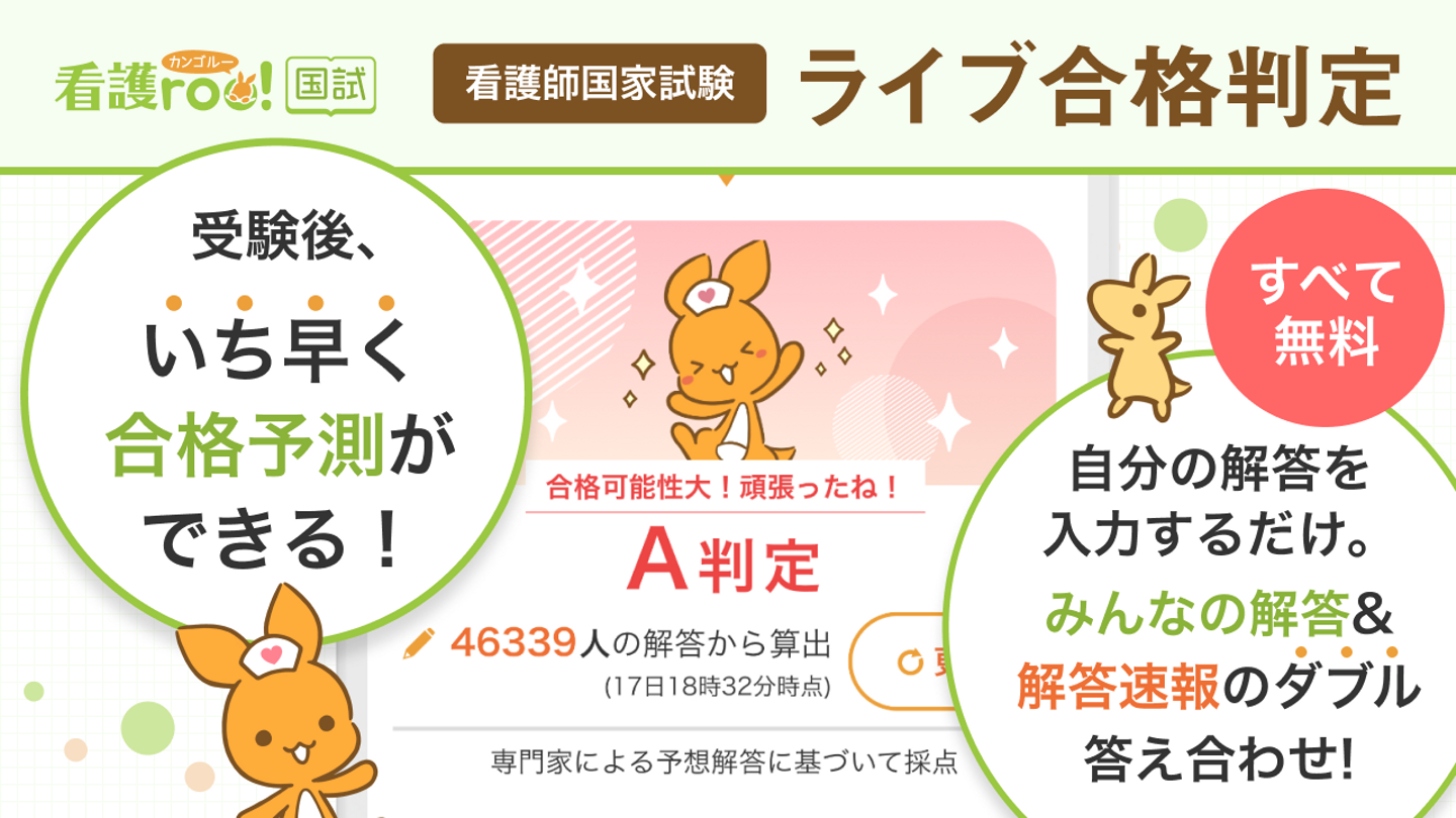 国試対策アプリとあわせて提供しているのが、試験後の合格判定サービス。受験生のみなさんは、試験に合格しているかどうか不安でいっぱい。そんなみなさんの「いち早く合否の可能性を知りたい」というニーズに応えるために、自分の回答を入力するだけで合格判定ができるサービスを毎年提供しています。