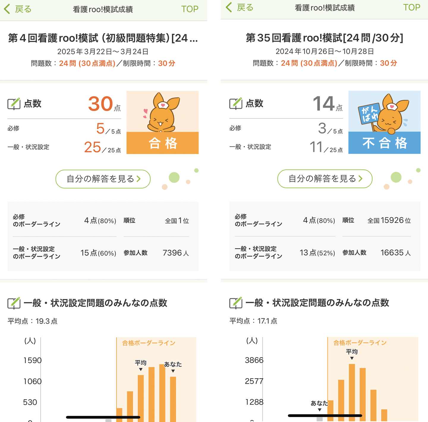 『看護roo!国試』では、スキマ時間に手軽に挑戦しやすい模試を定期的に開催している点も特徴です。合否の判定は実際の国試と同様で、必修問題のボーダーラインは正答率80%以上、一般・状況設定問題のボーダーラインは参加者の受験学年の結果を踏まえて設定。自分の点数や参加者の順位も見ることができます。