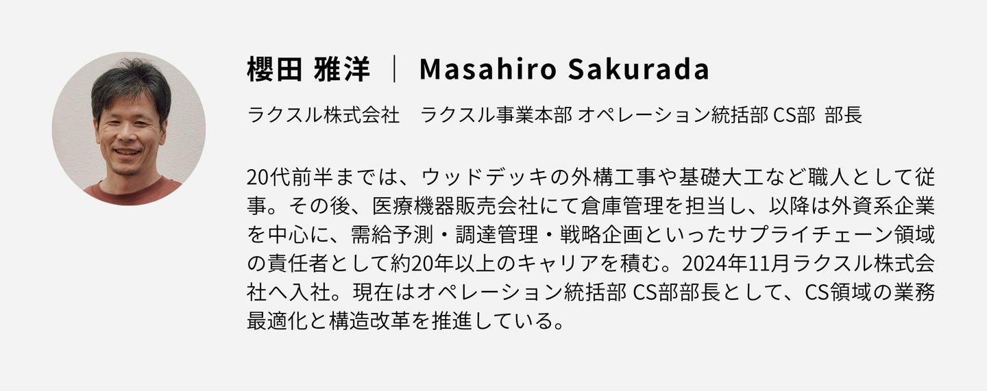 櫻田: 2024年11月に入社し、現在はオペレーション統括部CS部で部長をしています。それまでは外資系企業で20年以上、SCM(サプライチェーンマネジメント)に携わってきました。