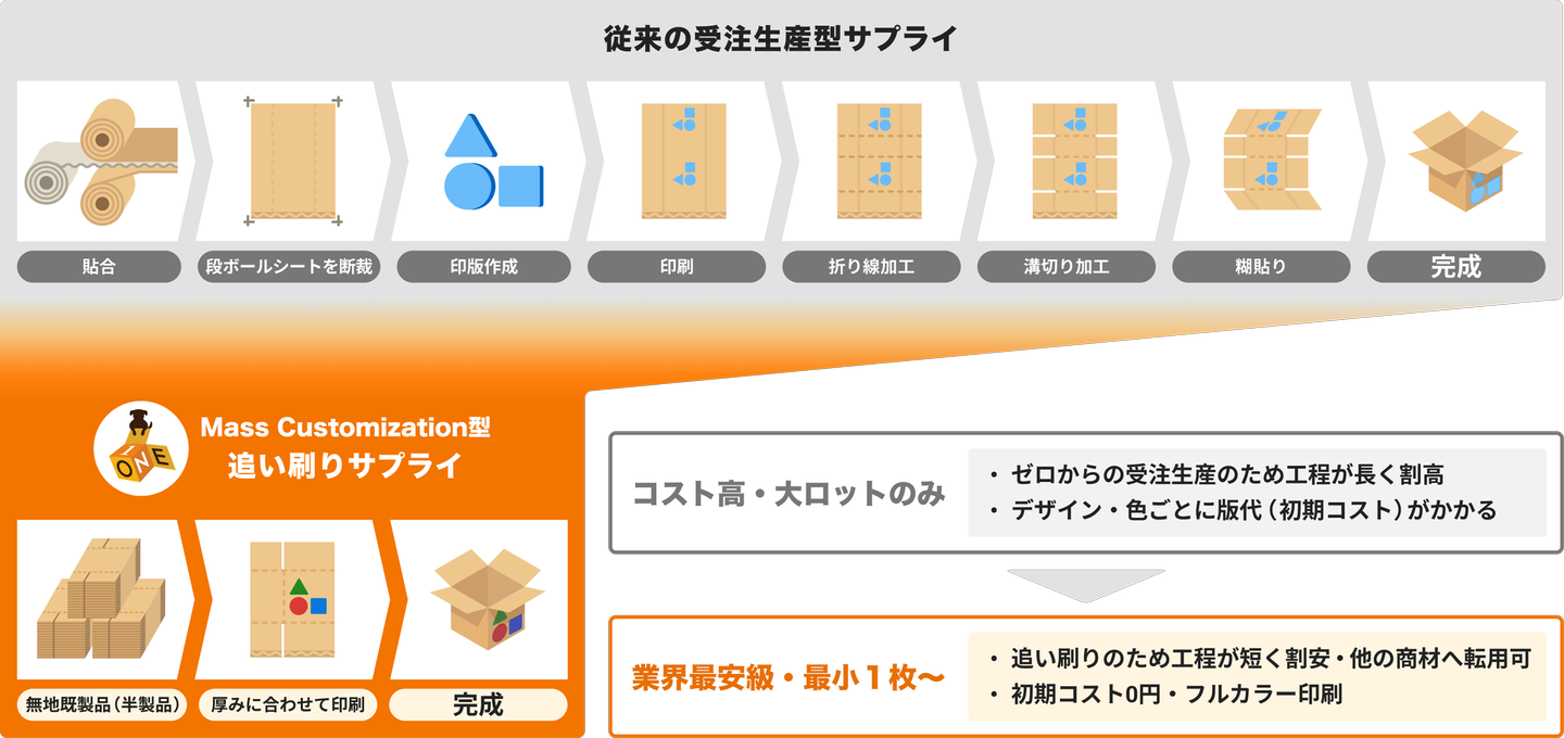 これまでの業界の常識であった受注生産方式ではなく、既に生産された“半製品”の段ボールに「追い刷り」すれば、コストメリットを最も出せるはず──