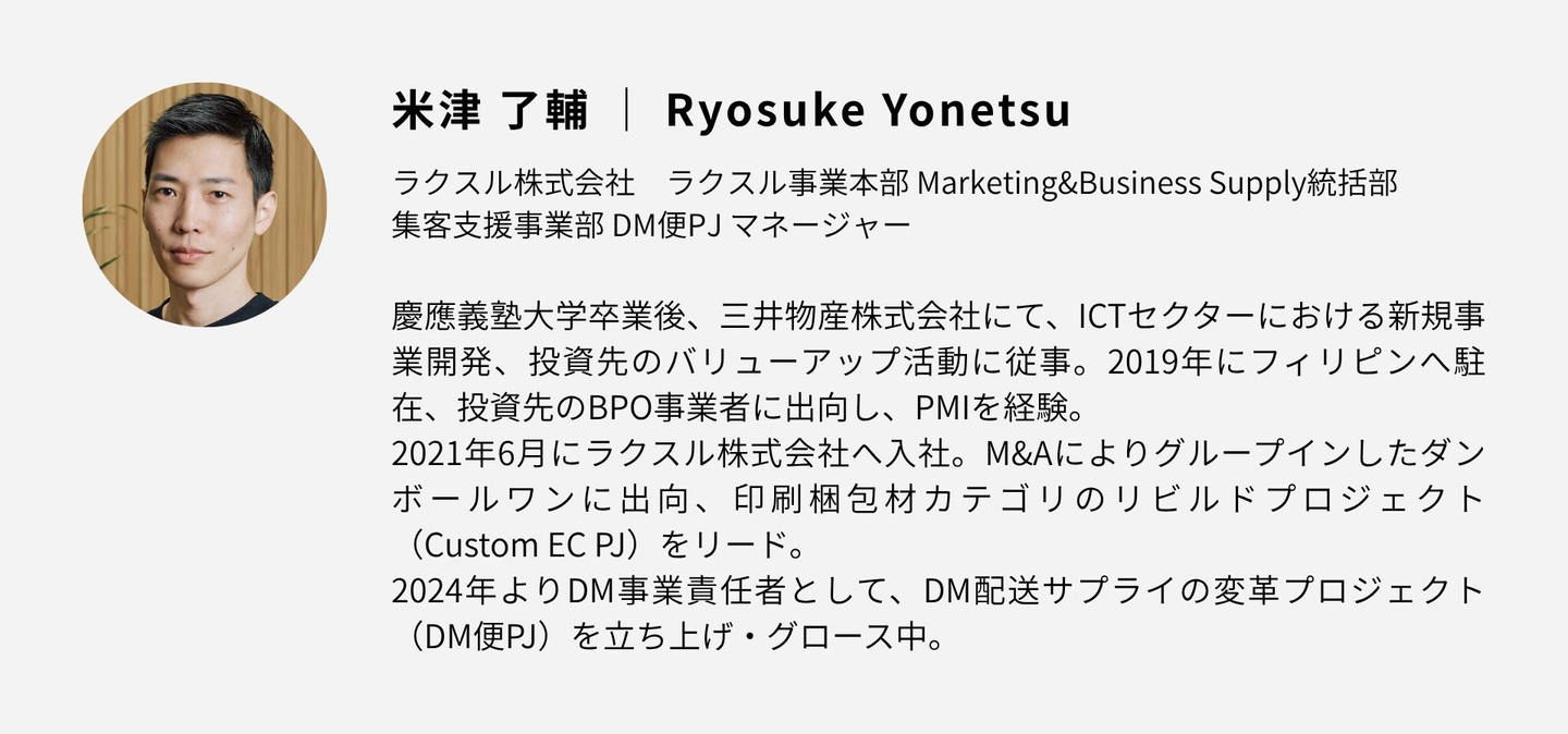 ダンボールワンでの変革プロジェクトを経て、2024年、ダイレクトメール(DM)事業責任者に着任。30年ぶりの郵便料金大幅値上げという地殻変動の中、明治維新以来の歴史を持つDMインフラをアップデートすべく、“地産地消”型のDM配送サプライ「ラクスルDM便」を立ち上げ。1,000億円規模のインパクト創出を目指し、グロース中です。