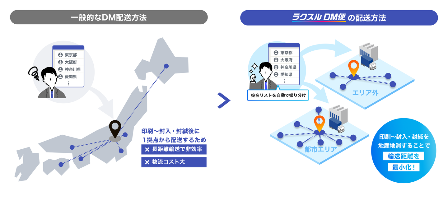 都市エリア配送特化により輸送距離を最小化・価格競争力のあるセイノーグループ・地区宅便と提携。宛先住所を基にエリア毎で最適な配送パートナーをマッチングする、業界最安級のDM配送サプライ「ラクスルDM便」が2025年に誕生しました。