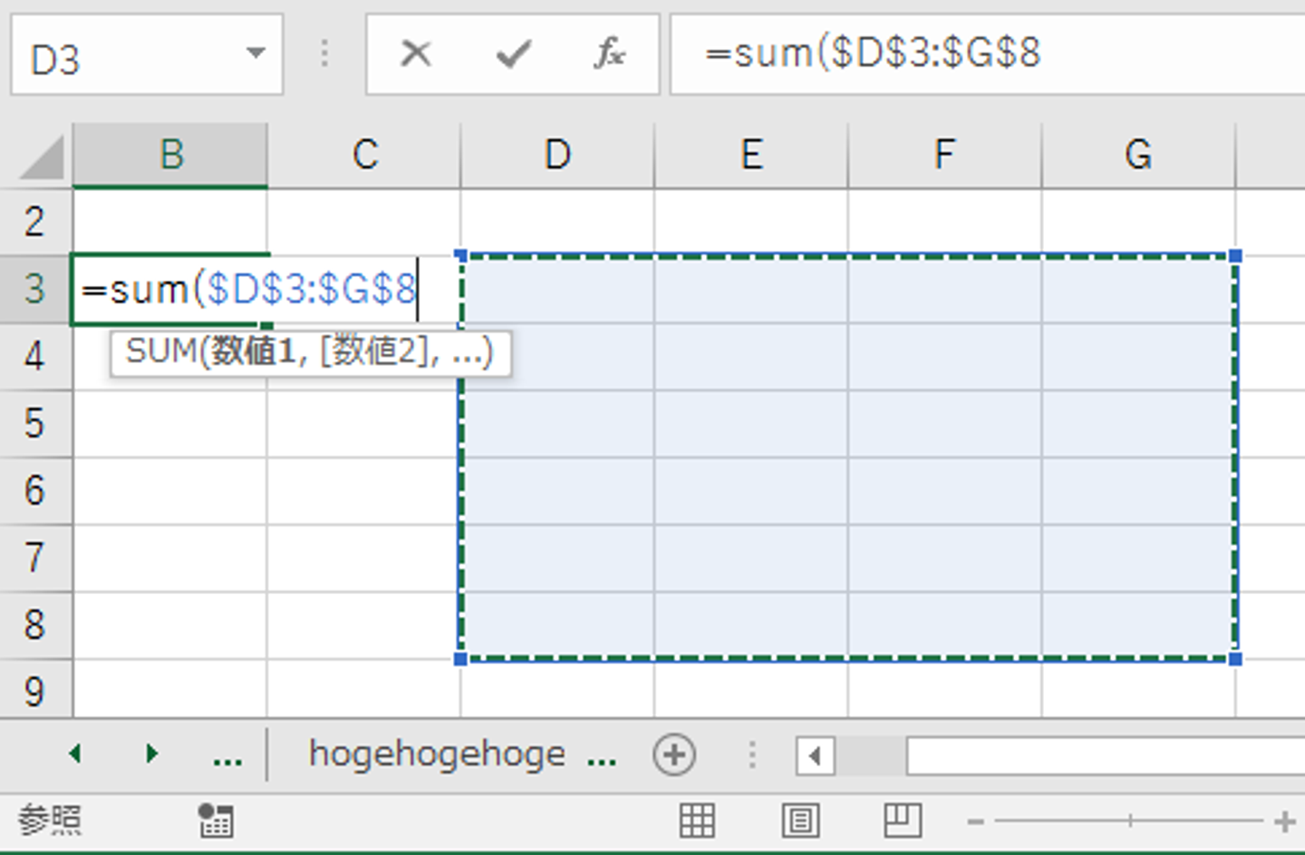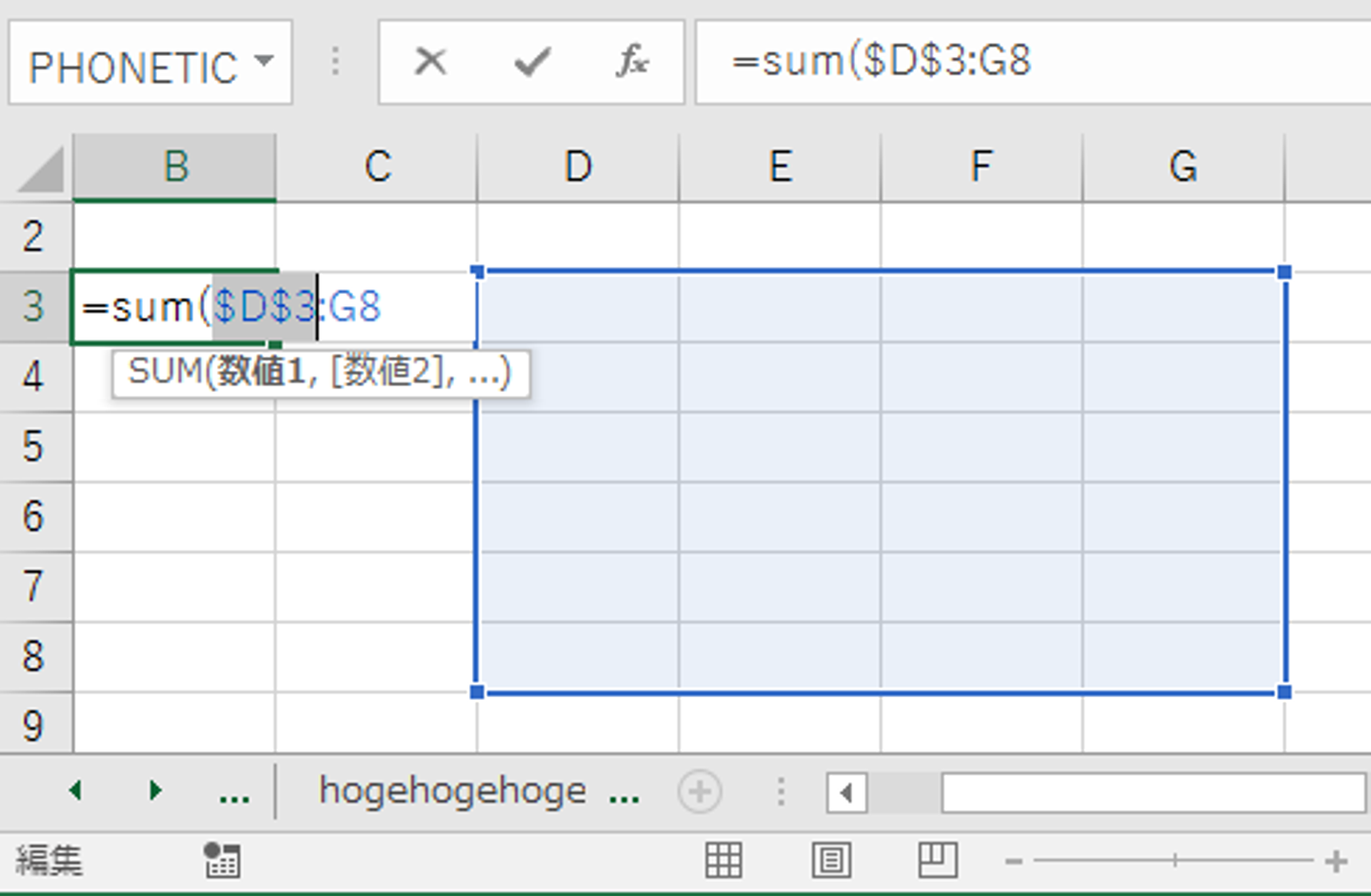 =sum($D$3:$G$8)のようにD3にもG8にも「$」を付けたい場合: