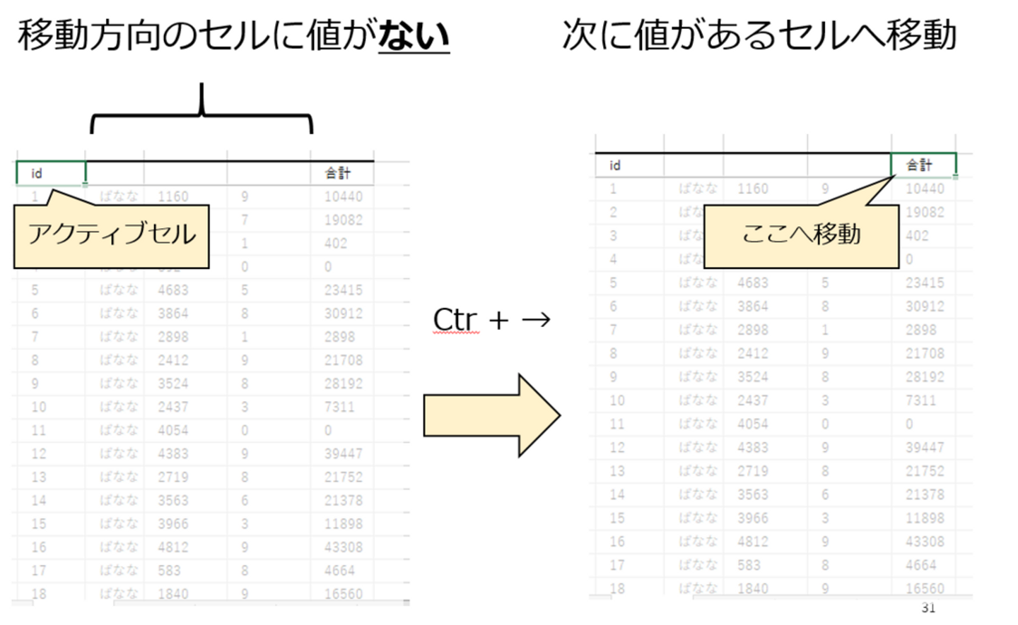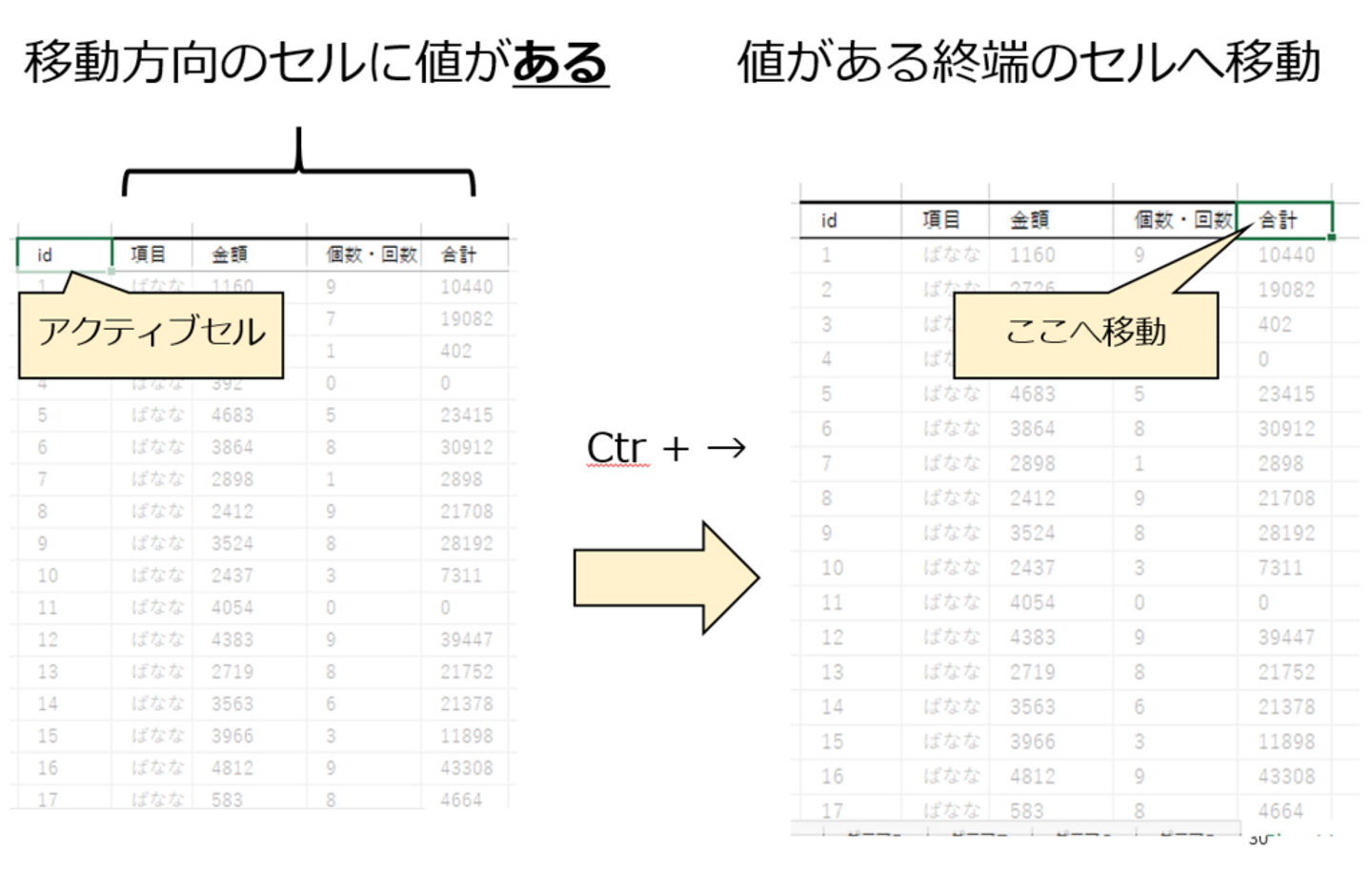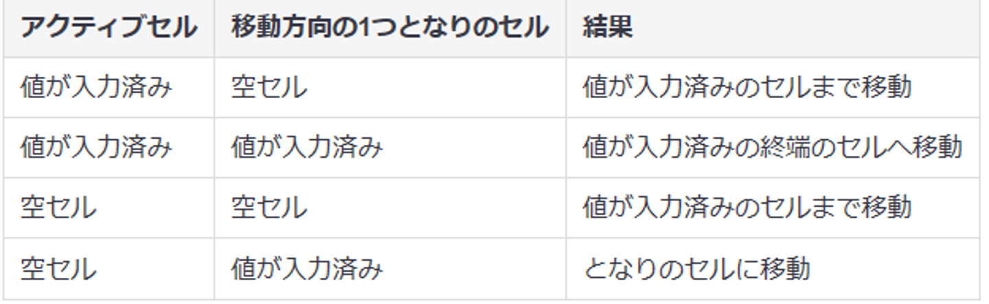 アクティブセルと移動方向の1つとなりのセルの内容で挙動が変わります.