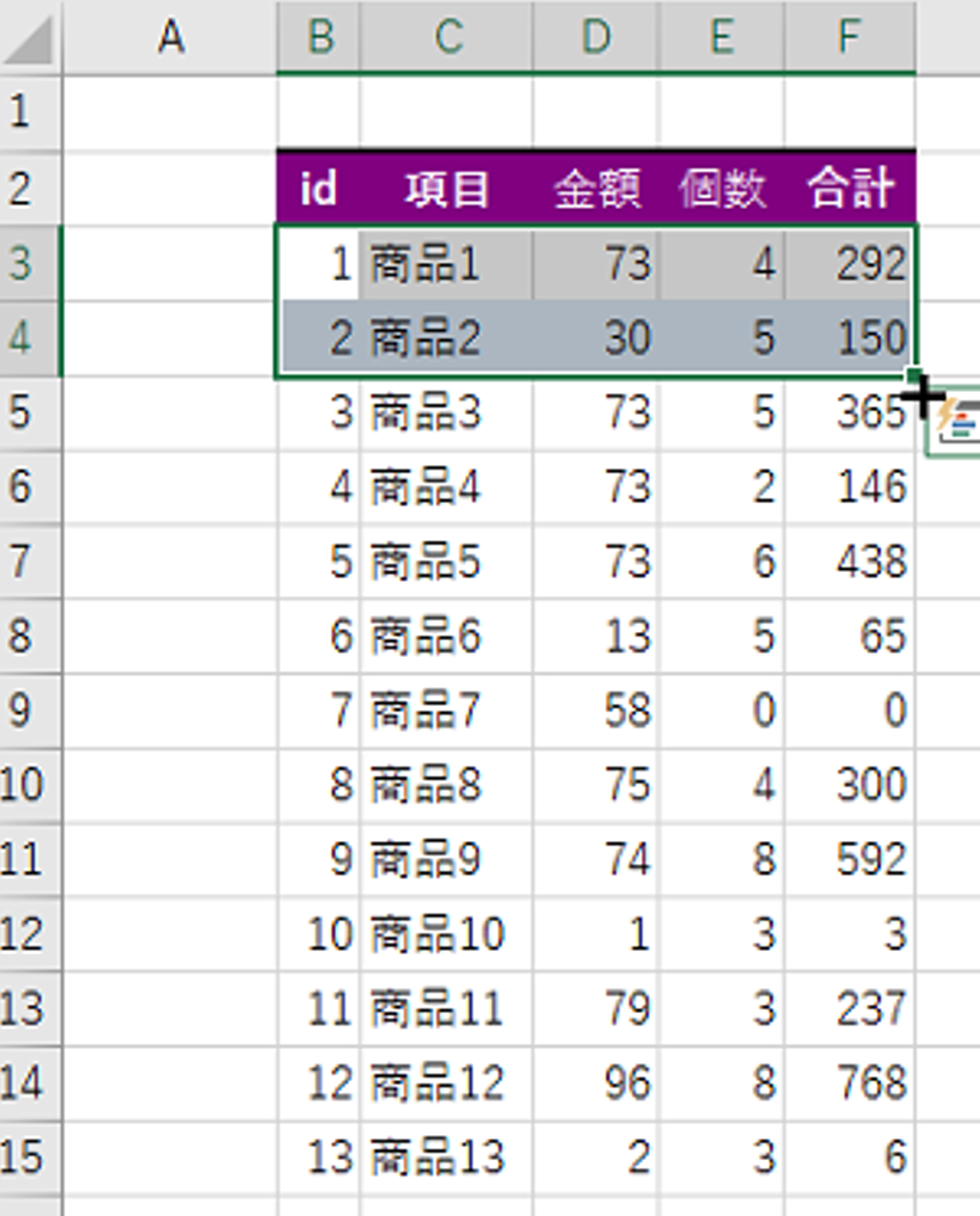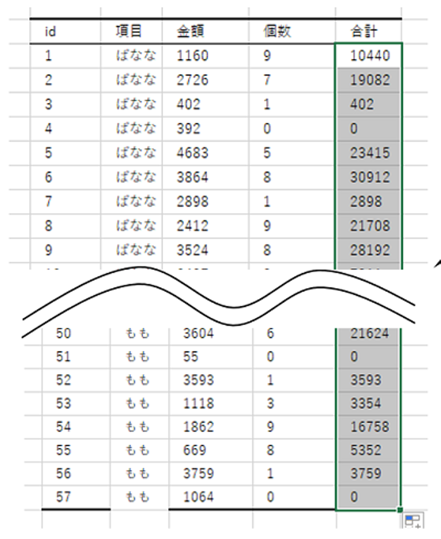 選択セルの■をダブルクリック:表の一番下までオートフィルを掛ける