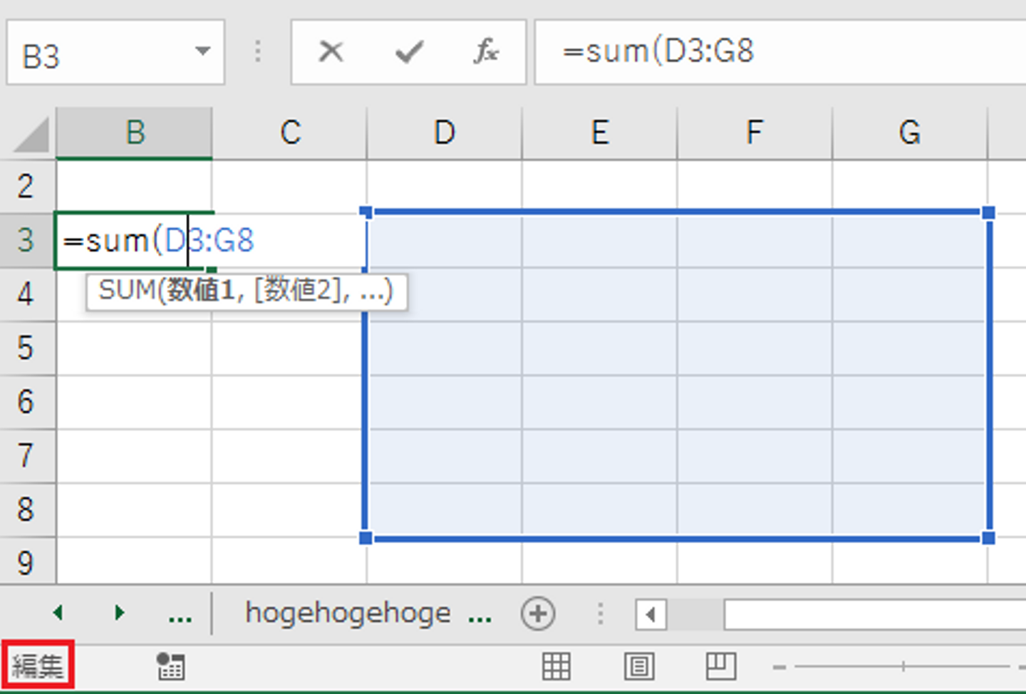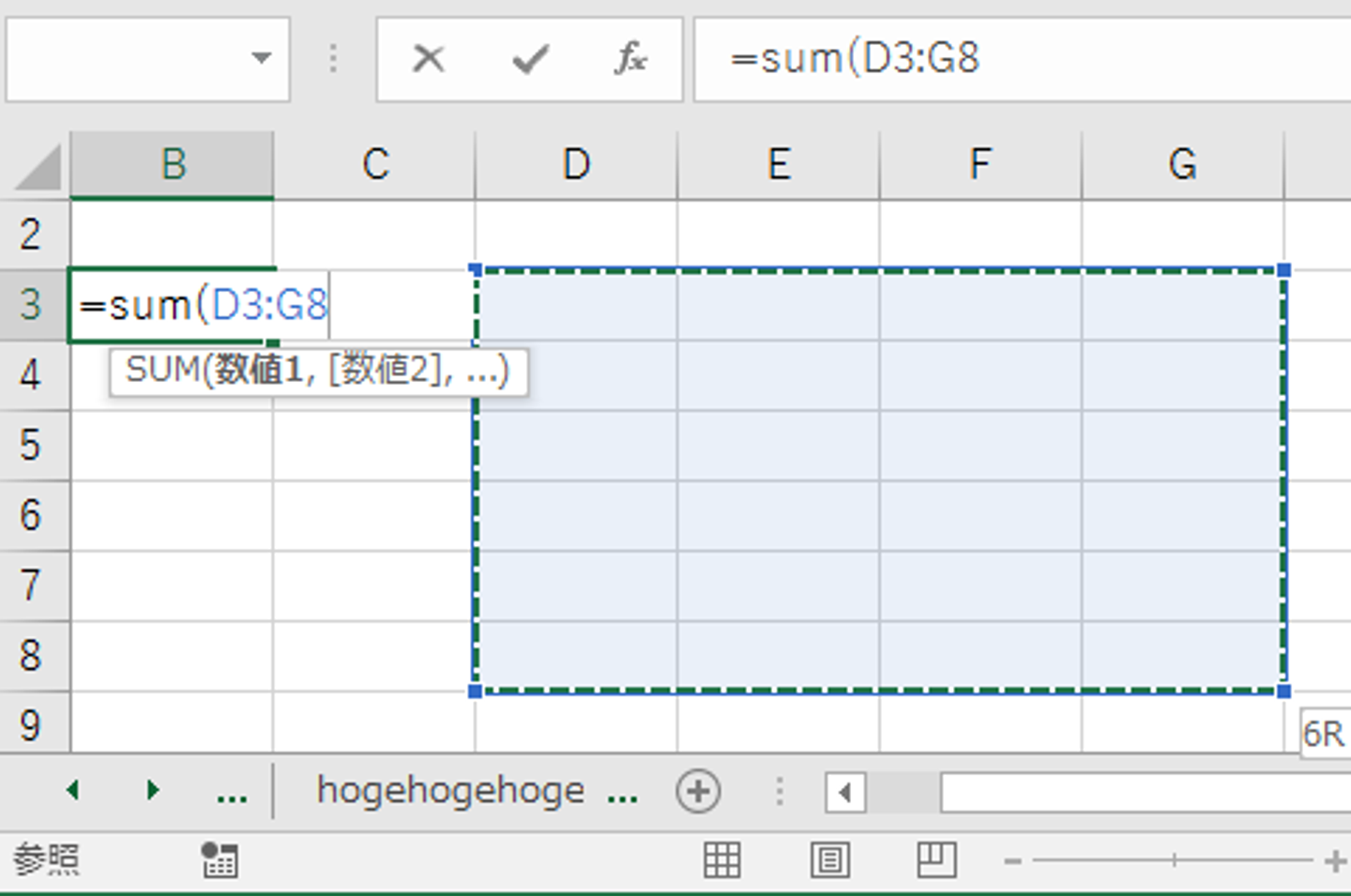 1. 範囲を入力(「=sum(D3:G8」の状態)
