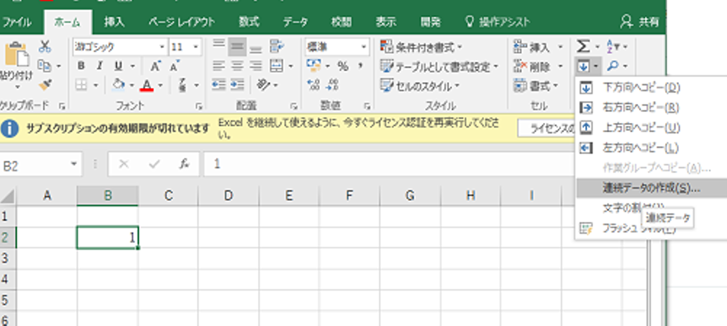 2. ホーム>「編集」のグループにある「フィル」>連続データの作成