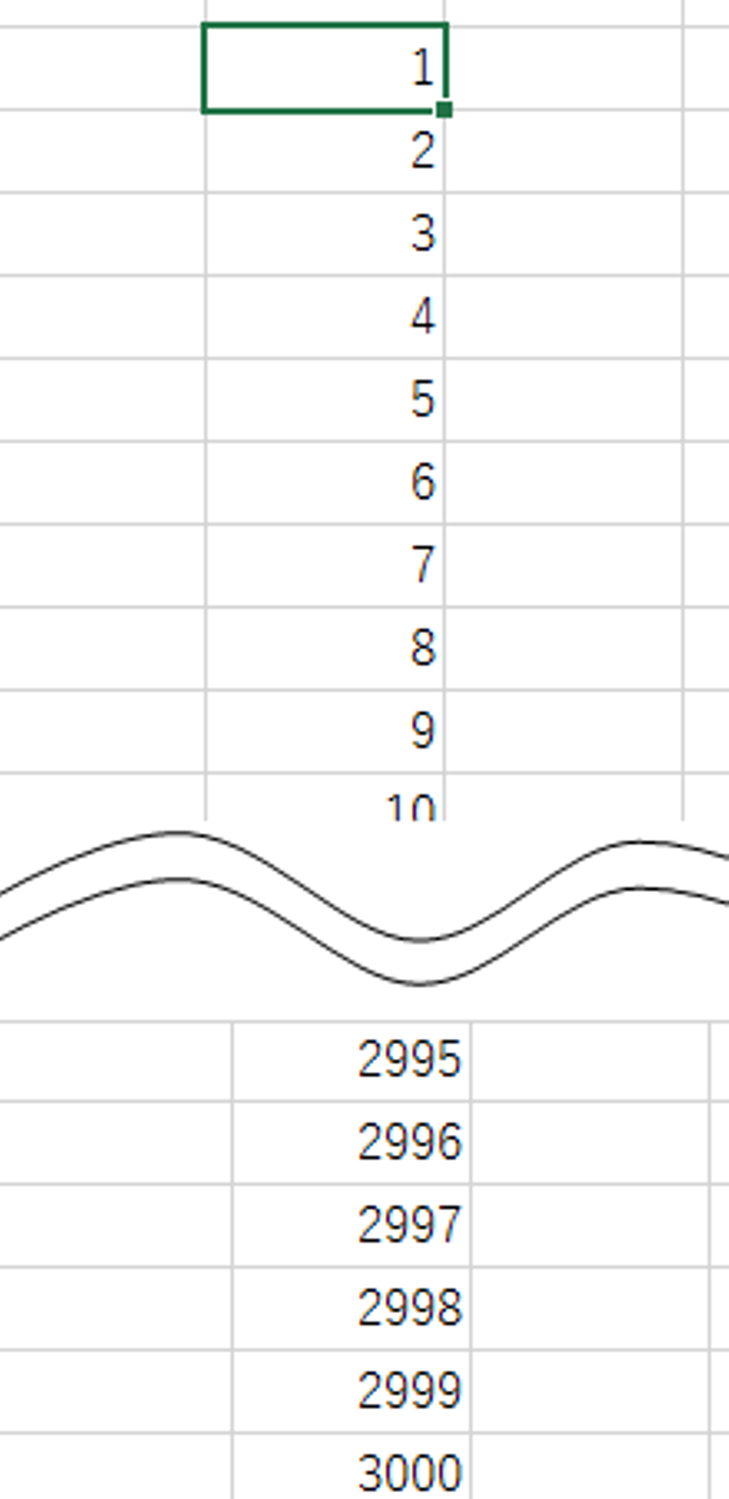 ID1~3000まで作りたいといった時,ドラックしてオートフィルを掛けると時間がかかります.しかし,前項の「表の一番下までオートフィルを掛ける」は他の列が入力済みでないと使えません.そんなときに使える機能です.