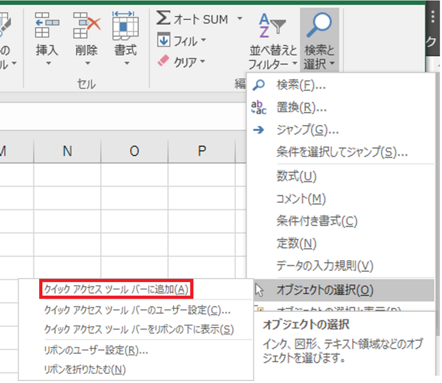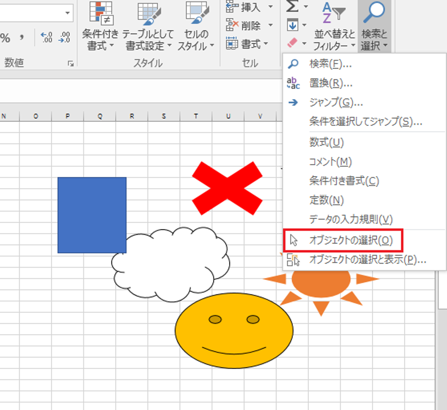 1. ホーム>「編集」のグループにある「検索と選択」>「オブジェクトの選択」