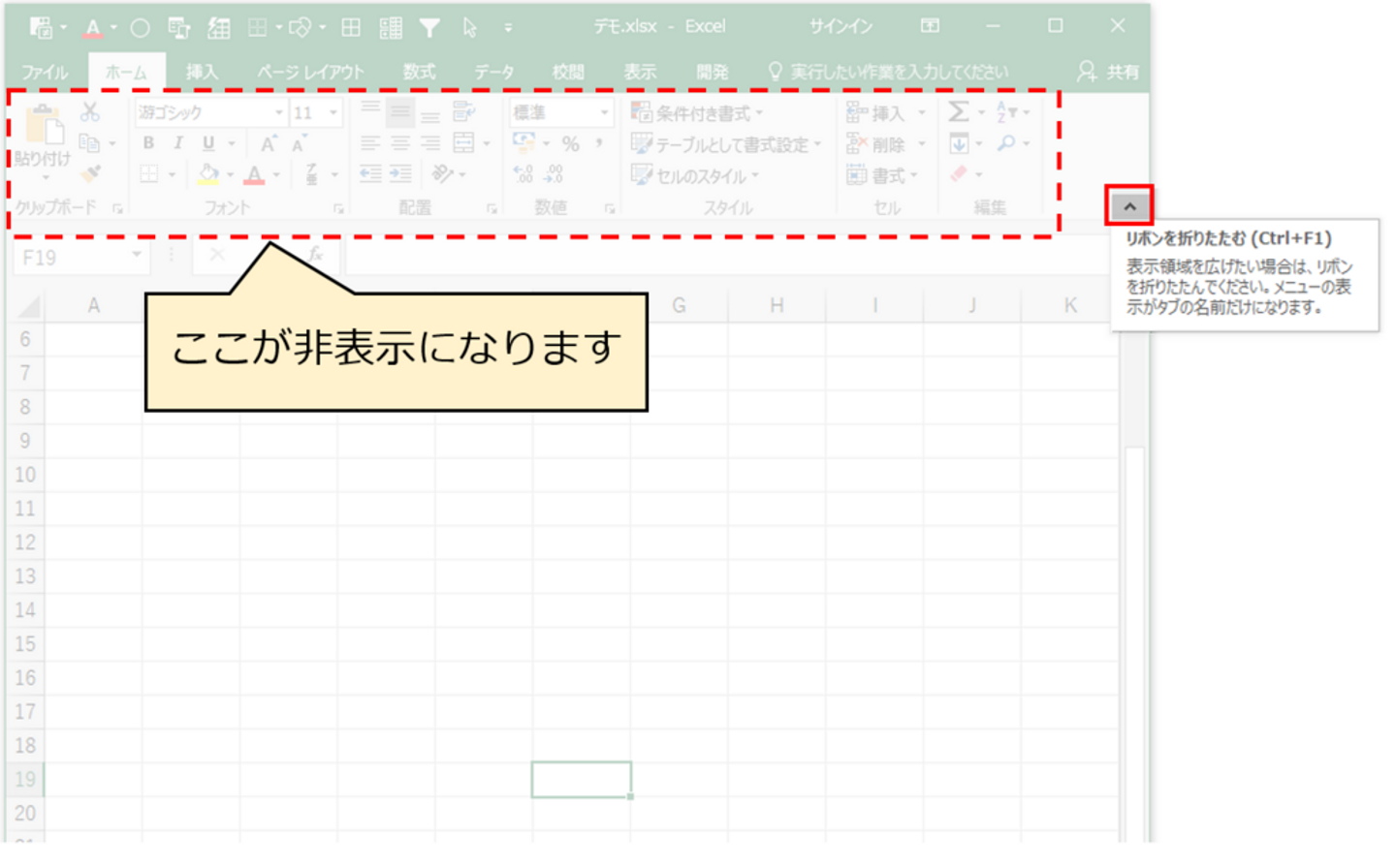 リボンを折りたたむ/結果:ツールバーが非表示になる