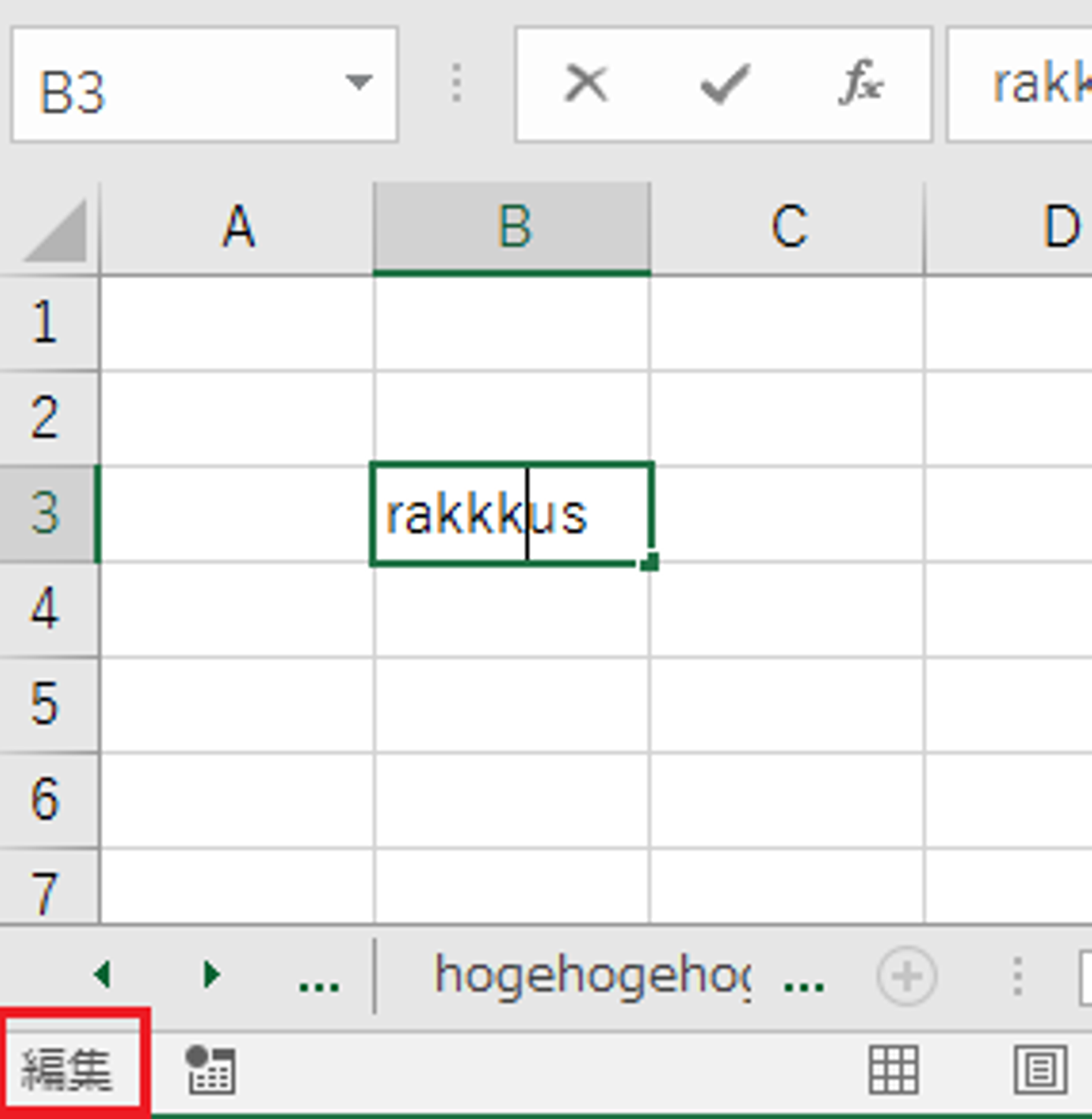 矢印キーを押すと,アクティブなセルの中で文字カーソルが移動します.図のように打ち間違いを修正したい時などに便利です. 例えば,B3セルに「rakkkus」と入力後「←」を押すと,B3セルの中でカーソルが移動します.