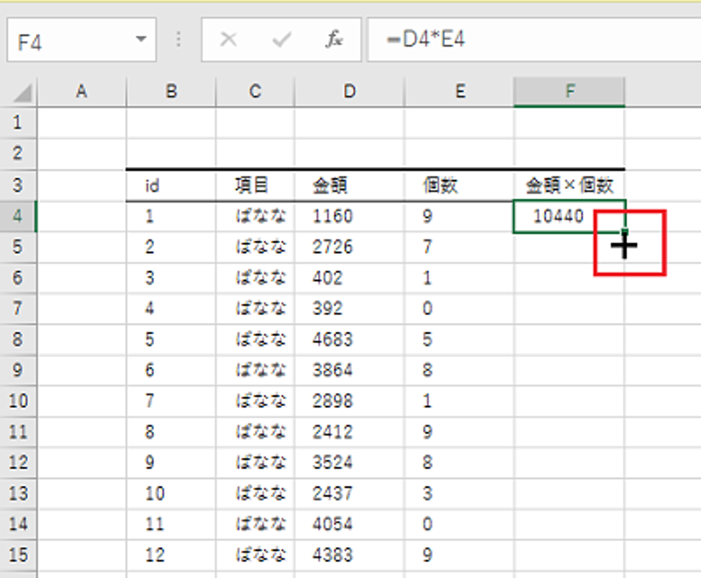 1. オートフィルを掛けたい列の起点となるセルにおいて,■の上にマウスカーソルを置く(「+」が表示されます.)