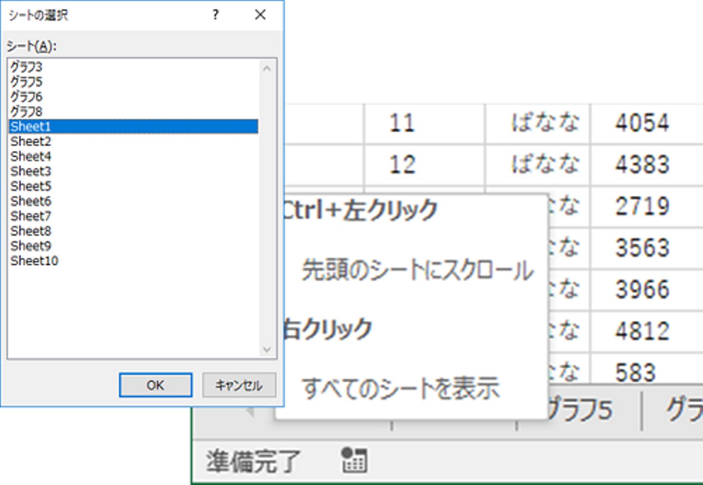 図のようにエクセルの左下の箇所(「◁ ▷」の所)で右クリックを押すとシート名の一覧が表示されます.