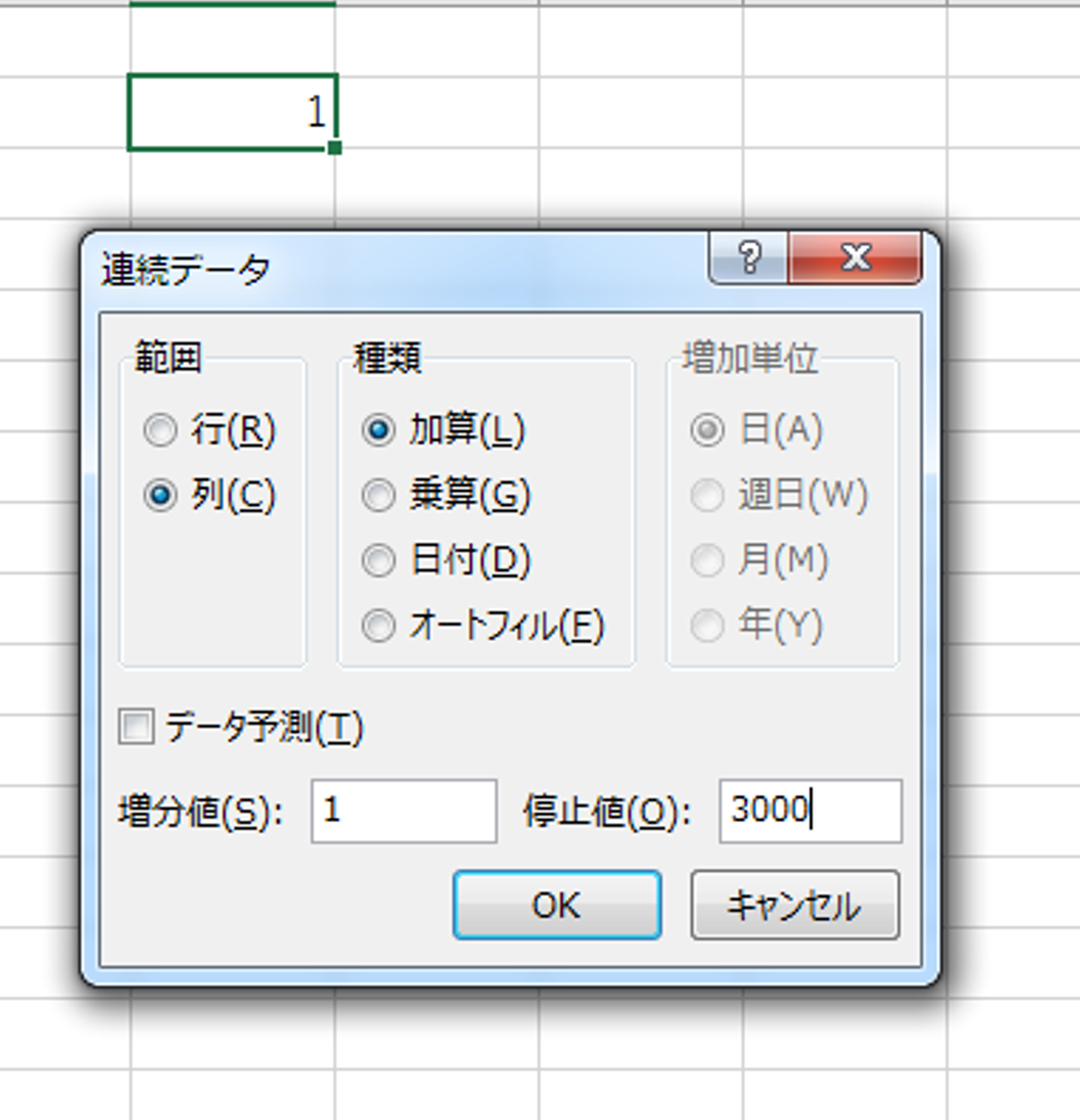 3. メニューに増分や停止値を設定しOK(図の場合,列(縦)方向に1から3000まで1ずつ値を入力します)