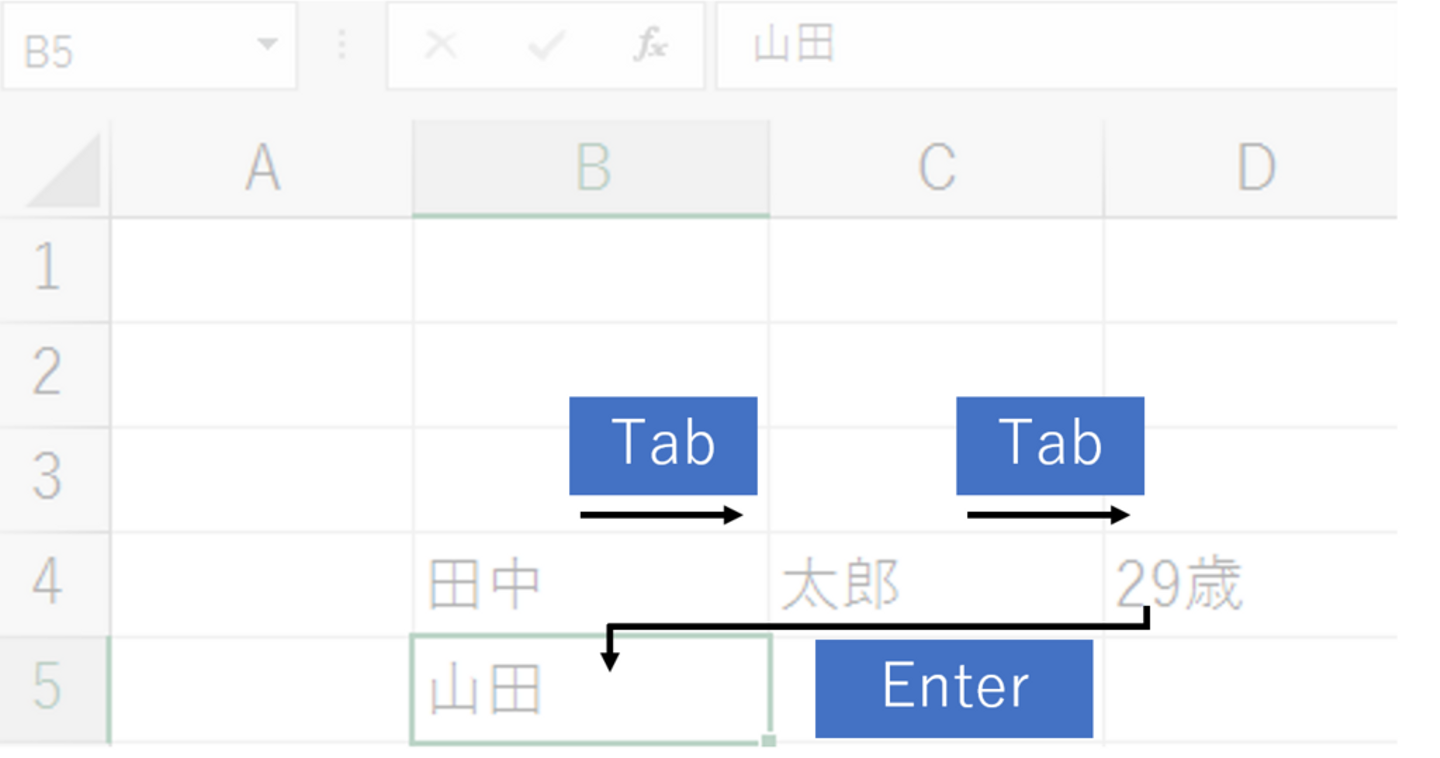 tabを押すと1つ右のセルへ移動します.また,Tabを押した後にEnterを押すと,初めにtabを押したセルの1つ下へ移動します.