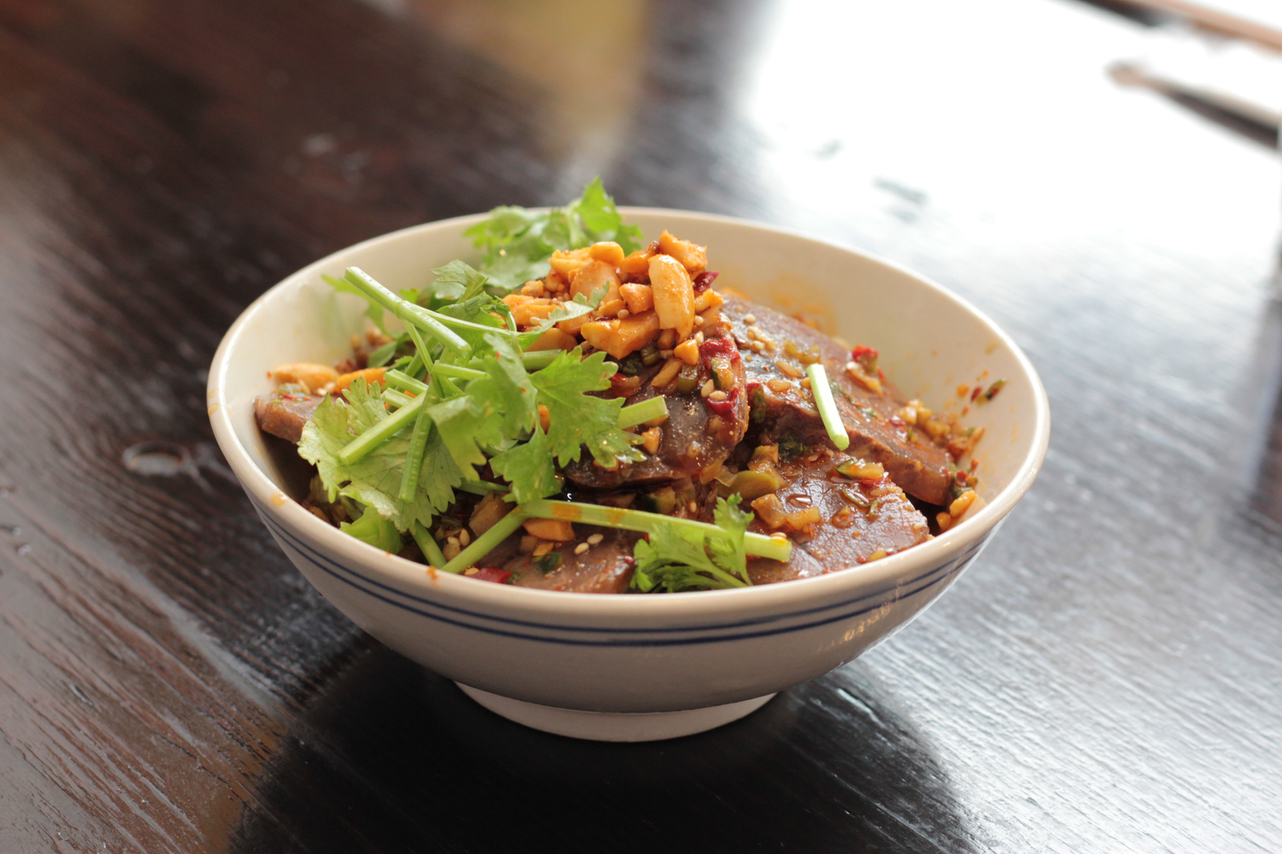 それから、お店の方に聞いた人気メニューの一つの「よだれラム」。よだれ鶏の羊バージョンですね。甘辛いタレとパクチー、異国風味がする香辛料が少し癖のあるラムと絡み合って、お昼から「ビールください!」とつい頼んでしまいそうになる美味しさです。