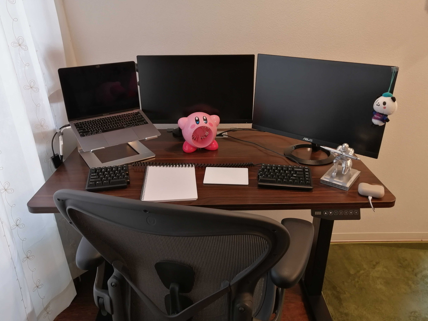2代目ラクマくん:ディスプレイが2枚もあるし、Kaitaさんと同じように昇降デスクだ!!こだわりポイントを教えて!