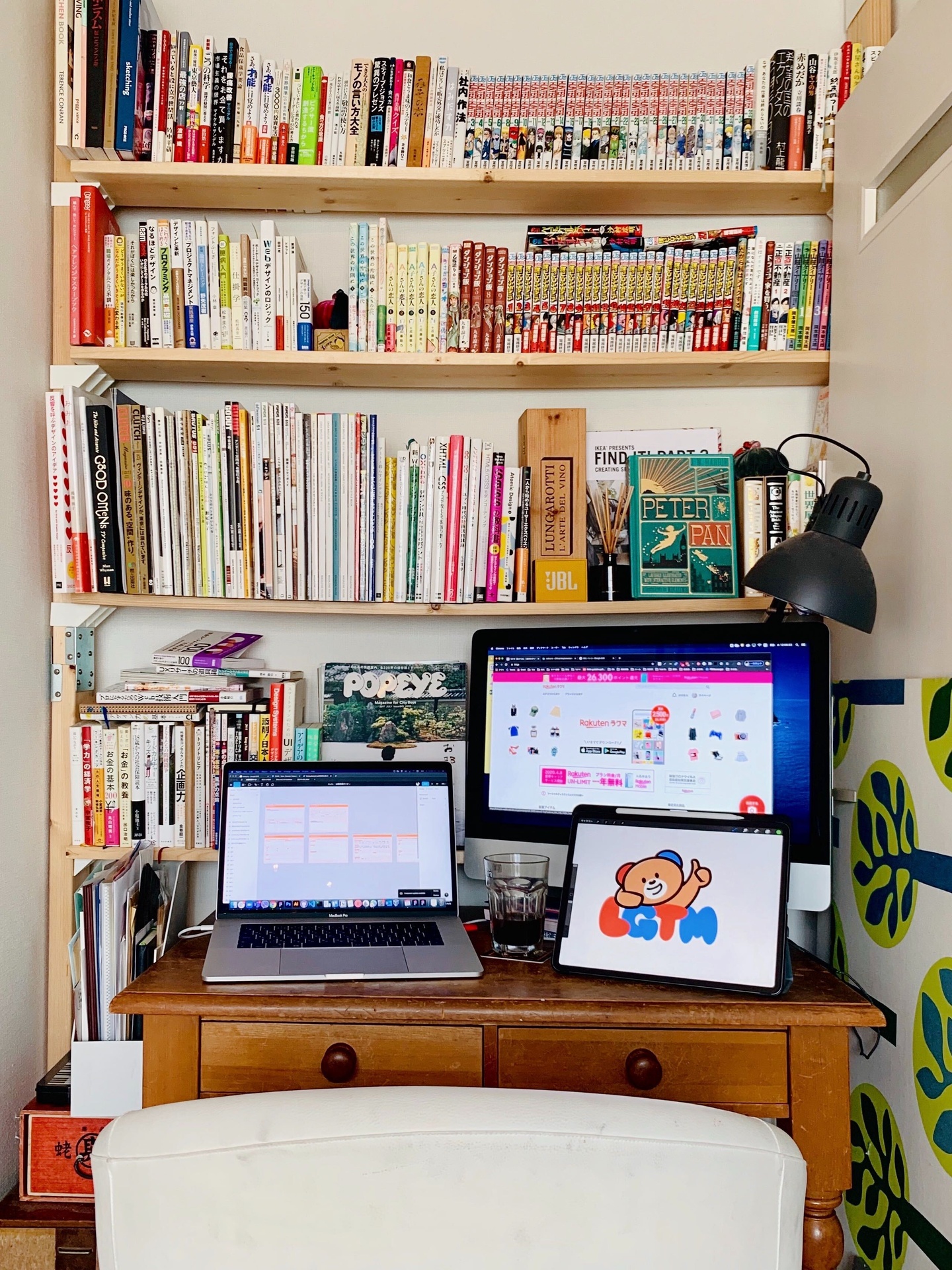 Yabecomさん:仕事に必要なデザイン書籍や、資料、趣味関連のものを集めていたらこんなにたくさんの本に囲まれてしまっています(笑)そうそう、リモートワークのこだわりポイントとしては、Luna Displayです!
