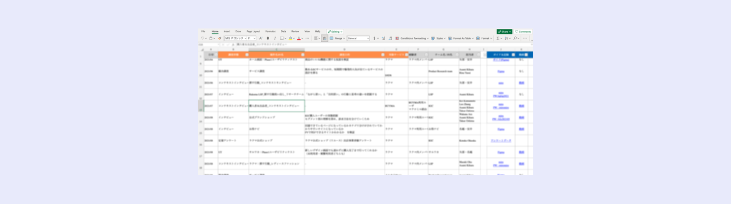 調査時期 プロジェクト名 / サービス名 調査目的 調査対象者 社内 / 社外など(調査会社にリクルーティングを依頼した場合はその旨も明記) 調査者 インタビューガイド(リンク) 分析結果レポート(リンク) まだ一覧シートを作っていない方がいたら時間を少しかけてでも過去の調査を掘り返してまとめると便利なので、作成してみてはいかがでしょうか?