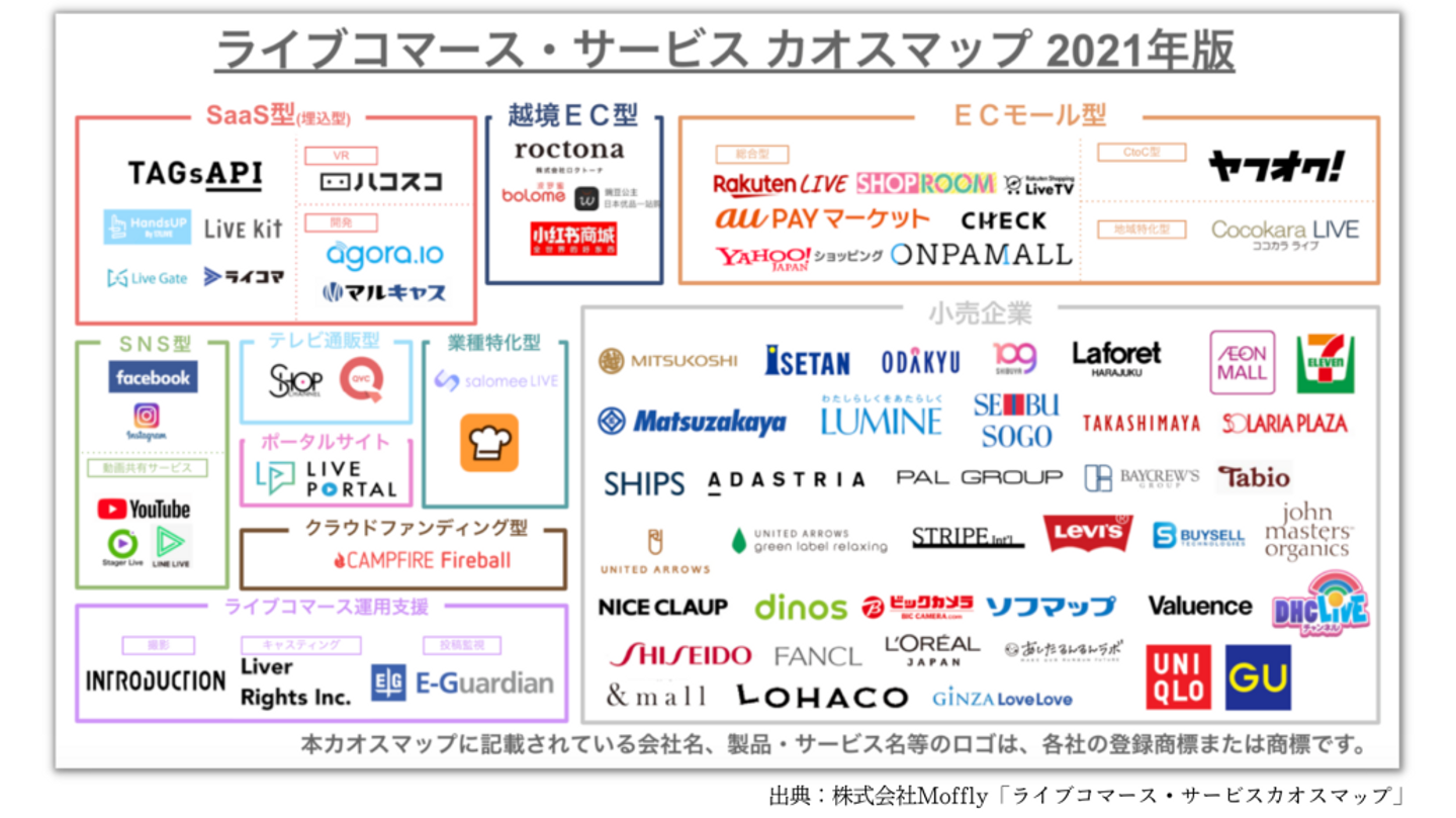 しかし、2021年のライブコマースの「 カオスマップ 」を見ると、結構さまざまな企業や、ライブコマースを展開しているサービスの企業が多い印象を受けます。 コロナ禍により、ECやライブコマースが再び注目をされ始めていて、楽天も「 楽天ショップチャンネル 」を新たに立ち上げるなど、再びライブコマースの波が日本にも来るのではないかと期待されています。