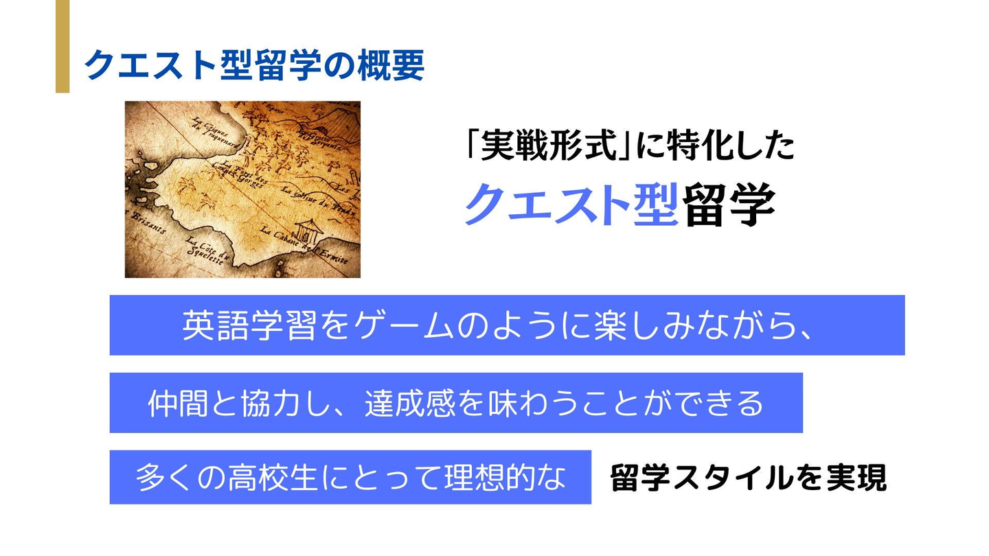本コンテストへの参加を通じ、私は自身の留学経験と高校生視点から、従来の留学モデルの課題を見直しました。現行のモデルでは、英語を使う場面が限定的で、特に引っ込み思案な日本の高校生にとっては、英語を避けることも可能な仕組みが課題です。また、短期留学では慣れるまでに時間がかかり、十分な成果を得ることが難しいと感じました。「クエスト型留学」のモデルは、「ミッション×留学」をコンセプトに、アクティビティや日常生活にミッションを設け、ゲーム感覚で英語を活用する仕組みです。これにより、楽しく英語を学べるだけでなく、自己解決力や協働力といった社会で必要なスキルも同時に養えます。報酬や多彩なミッションで挑戦意欲を高め、英語学習と自己成長を両立できる理想的なスタイルを目指しています。