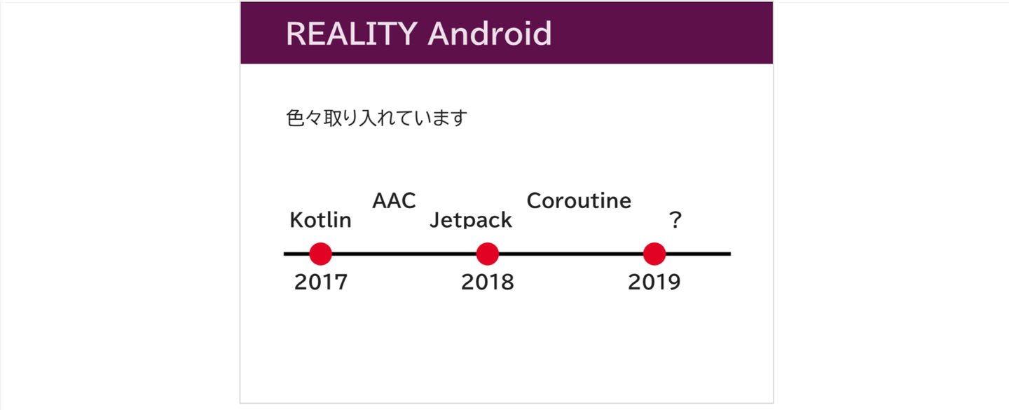 他にもREALITY AndroidはそもそもコードがFull Kotlinであるとか、AAC以外のJetpackライブラリをフル活用しているだとか、最近だとCoroutineを導入してみたりだとか、開発スタートが最近であり、コードベースがまだ小さいことも活きて、比較的新しい技術を積極的に取り入れることができています。