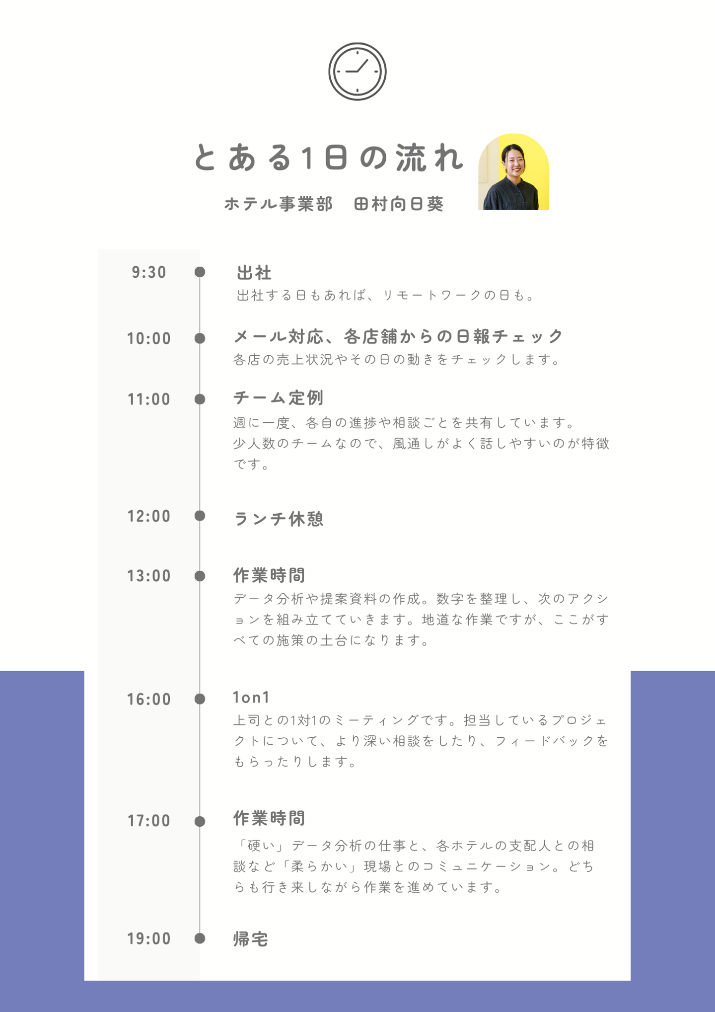 「くらし・生活をリノベーションする」をコンセプトに、既存建物の再生や施設運営を手掛けるリビタ。現在、ホテル事業部の営業・マーケティング職を募集しています。この記事では、入社7年目の田村向日葵さんにお話を伺いました。とある1日の流れから、「現場のリアル」と「データ」をやわらかに繋ぐという具体的なお仕事内容、大切にしていることなどを紹介しています。ぜひ最後までご覧ください!