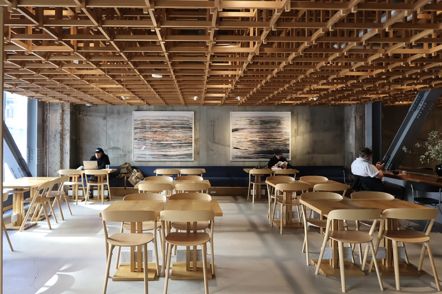 ▲KUMU金沢のラウンジスペースー素材の組み合わせが魅力的