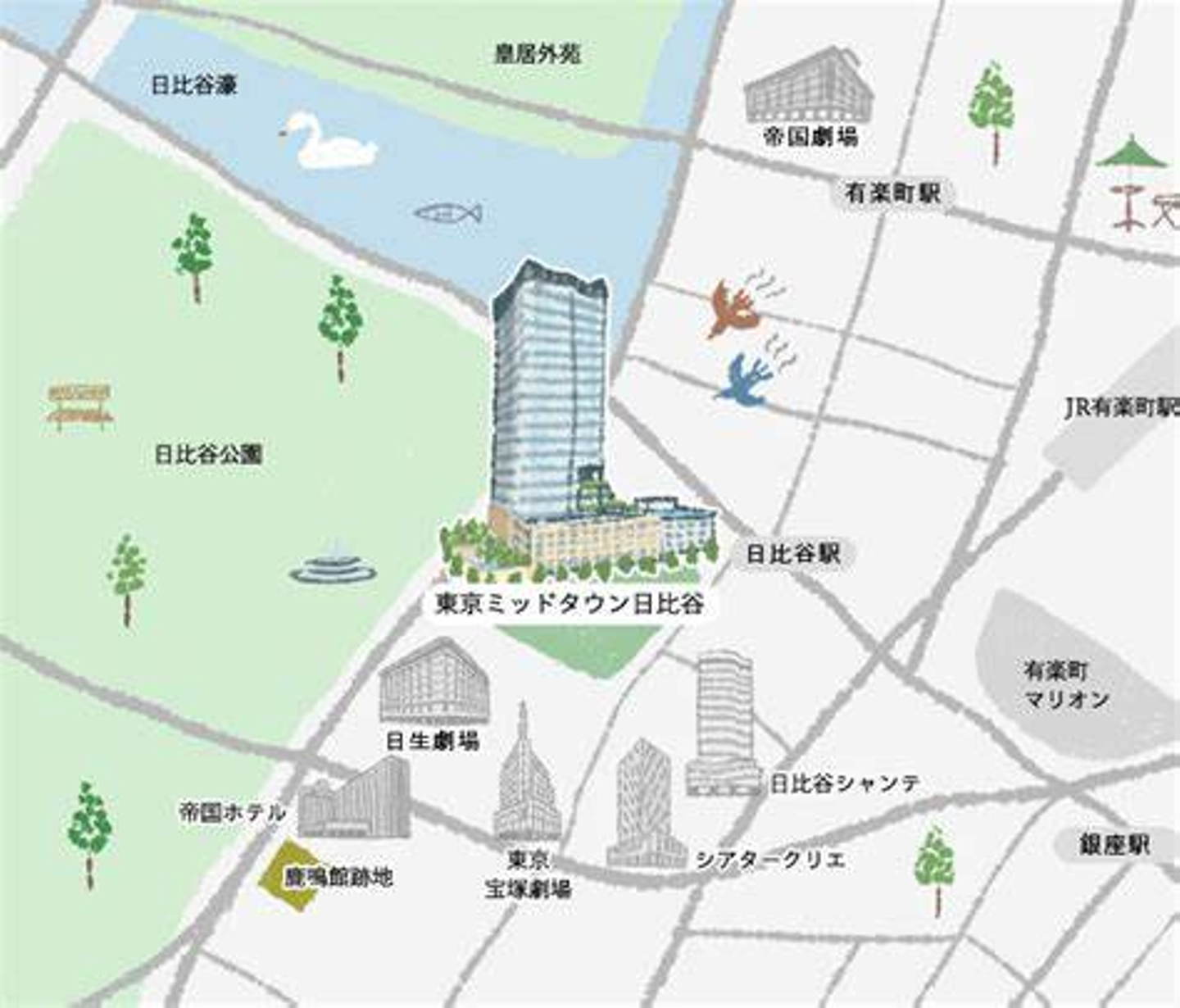 東京宝塚劇場や帝国劇場、帝国ホテルにペニンシュラ東京など伝統ある建物が立ち並ぶ一等地かと思えば、すぐ近くには日比谷公園や皇居外苑など、とても東京のど真ん中とは思えないほど、緑豊かでほのぼのとした場所にあります!