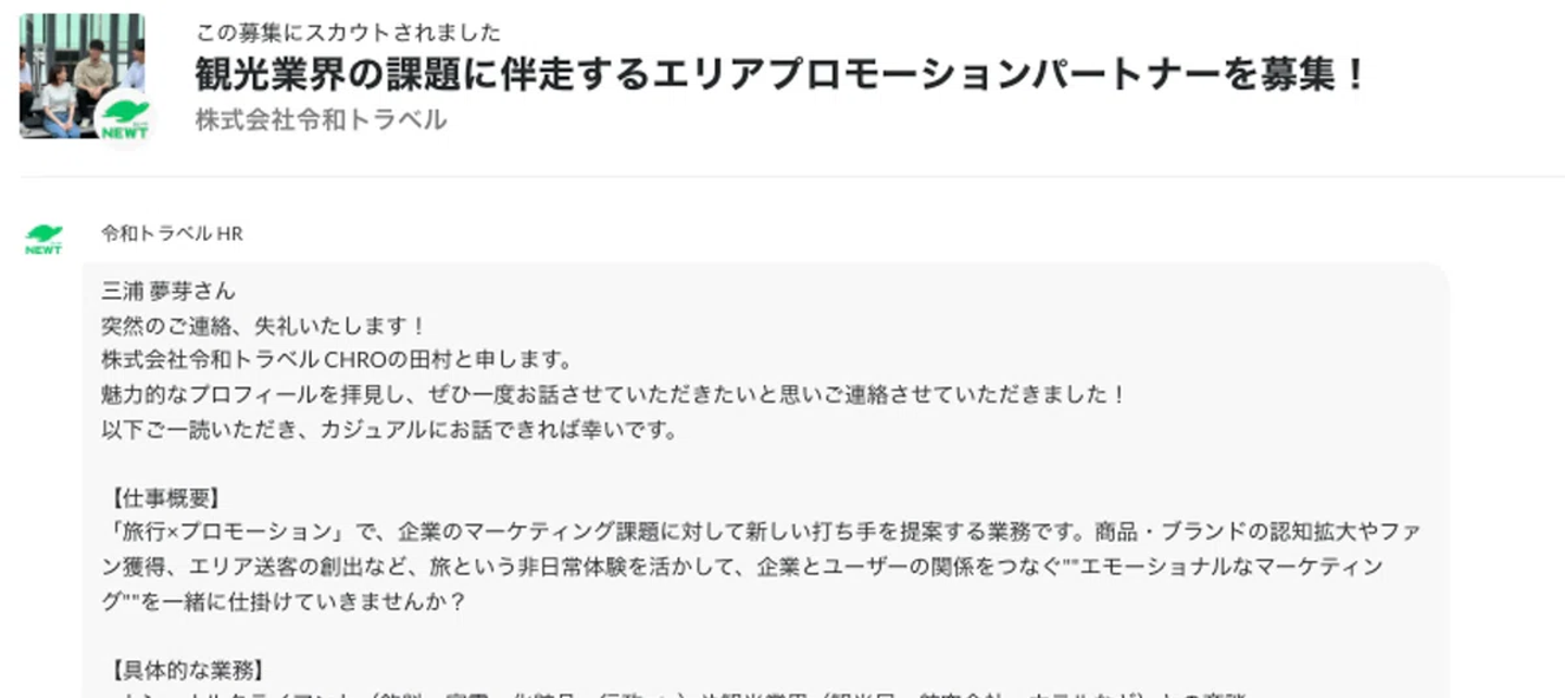 私のcan(できること)とWill(やりたいこと)をどちらも叶えたい。そう考え始めたタイミングで、令和トラベルからのWantedlyスカウトが届きます。