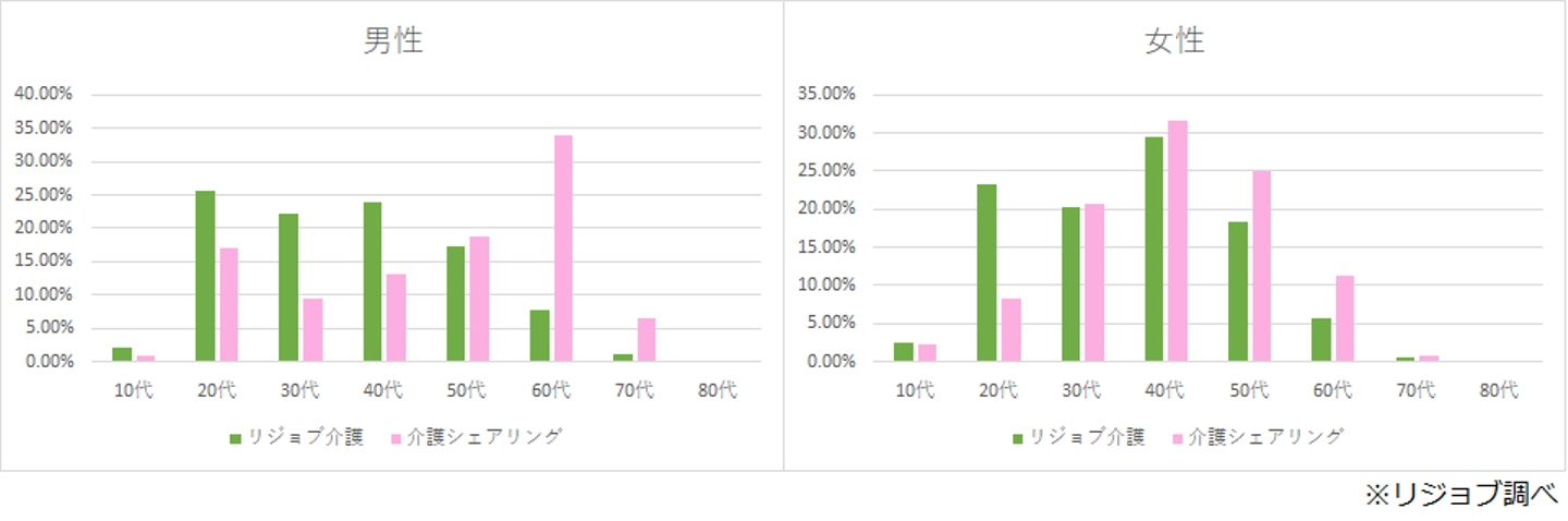上図はリジョブ介護(通常の介護求人)と介護シェアリング(短時間・業務特化型の介護求人)に登録している実際のユーザーの割合を示したグラフです。